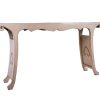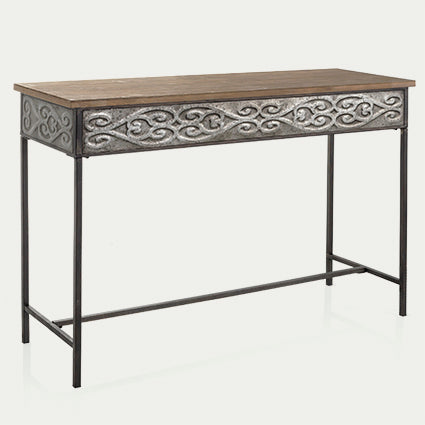 Consolle da ingresso con struttura in ferro con effetto anticato, dove emrgono le decorazioni arabesche. Alla struttura si associa un piano in legno naturale.
