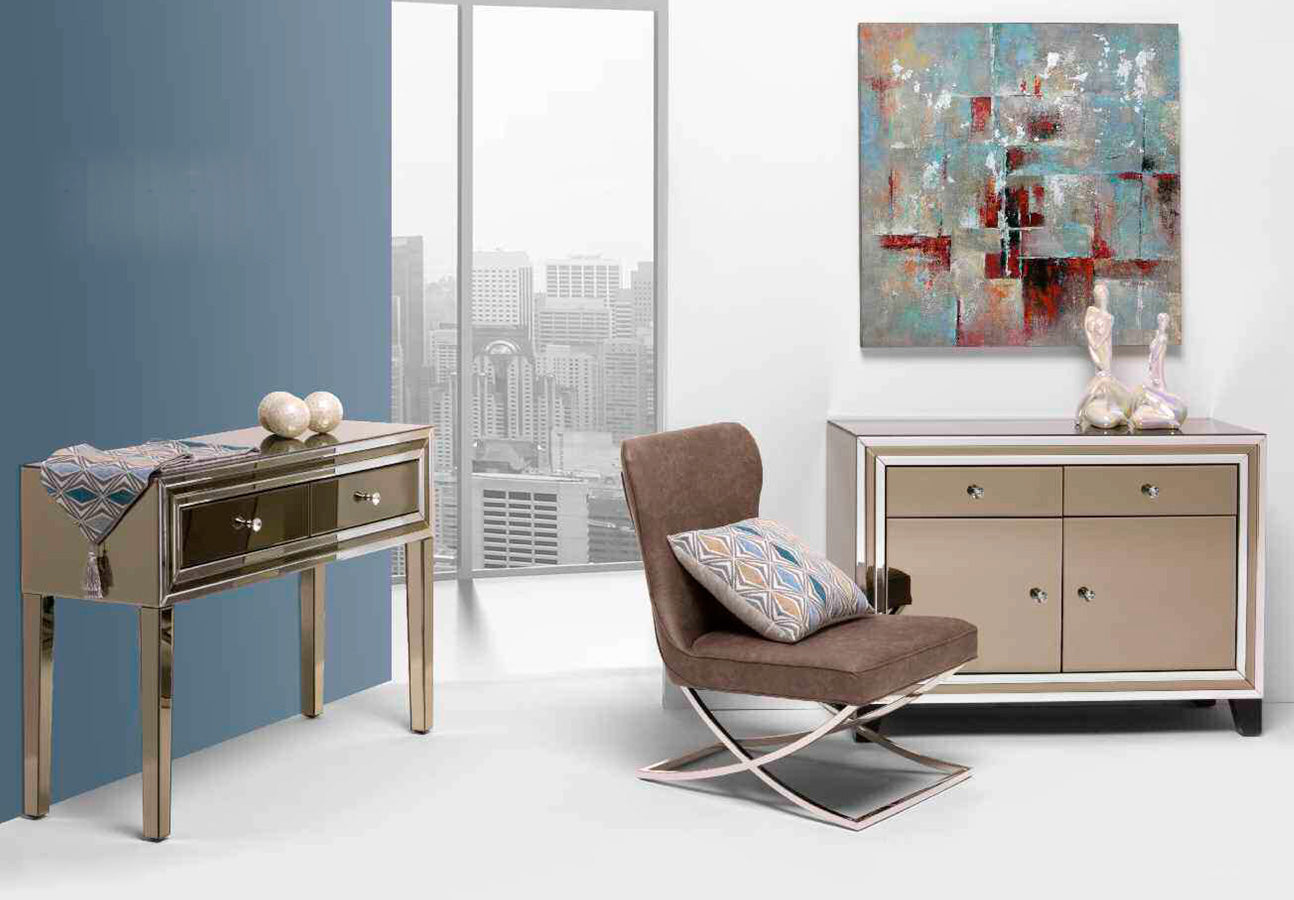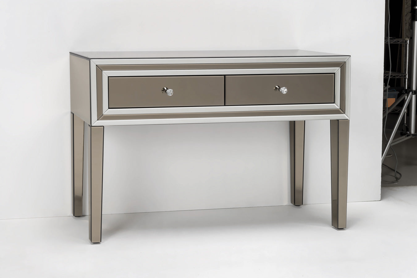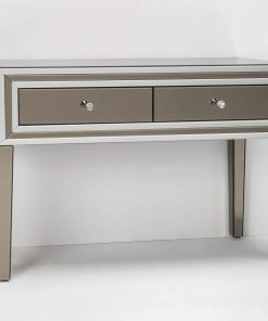 Consolle moderna con due cassetti, esempio di eleganza e accuratezza del design, realizzata con specchi in due colori silver e beige, arricchita anche da pomelli gioiello.