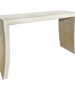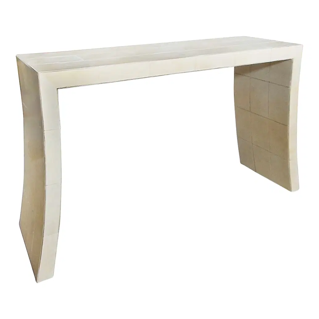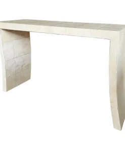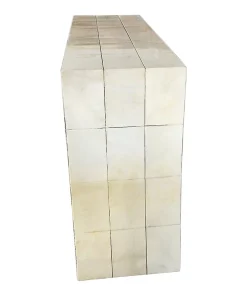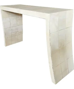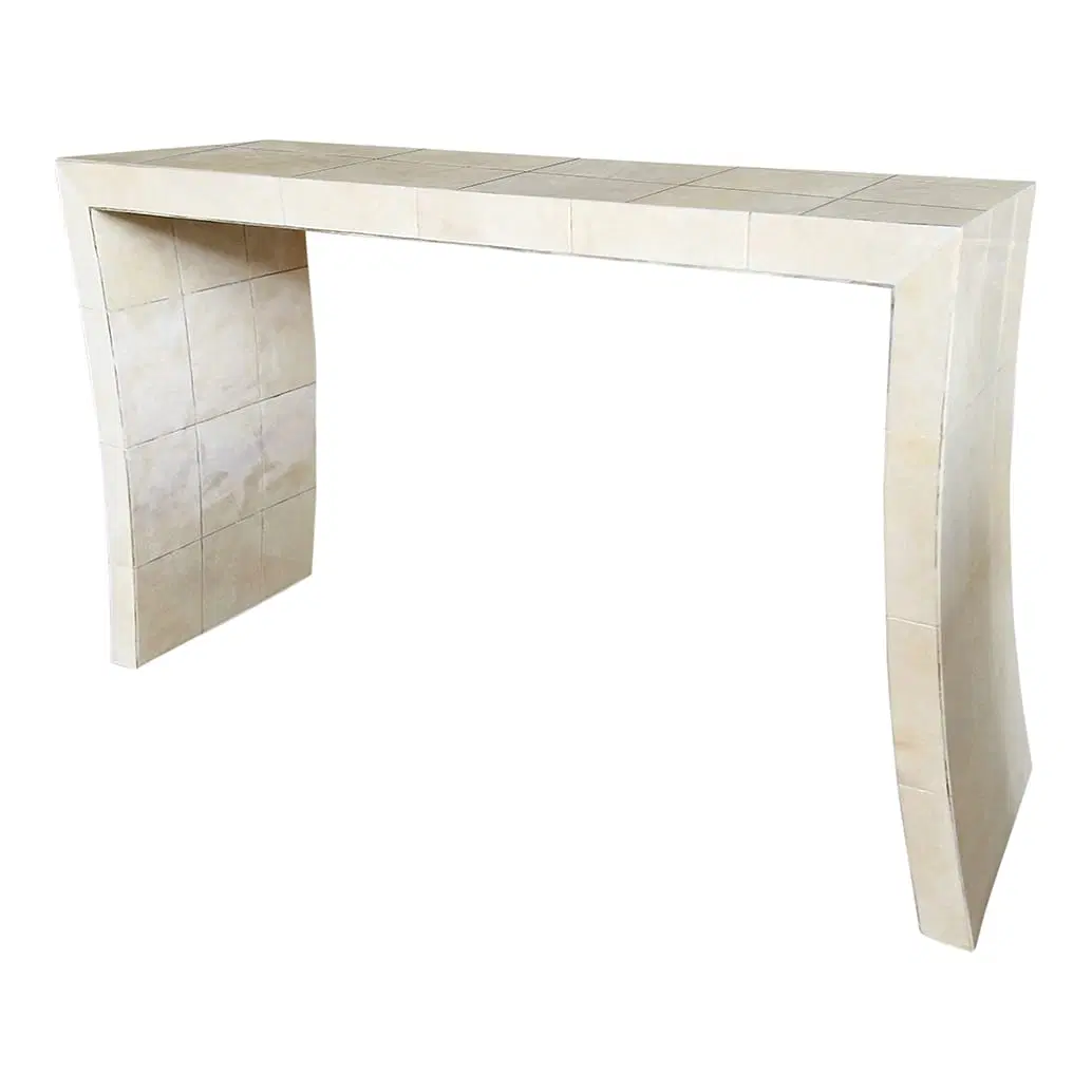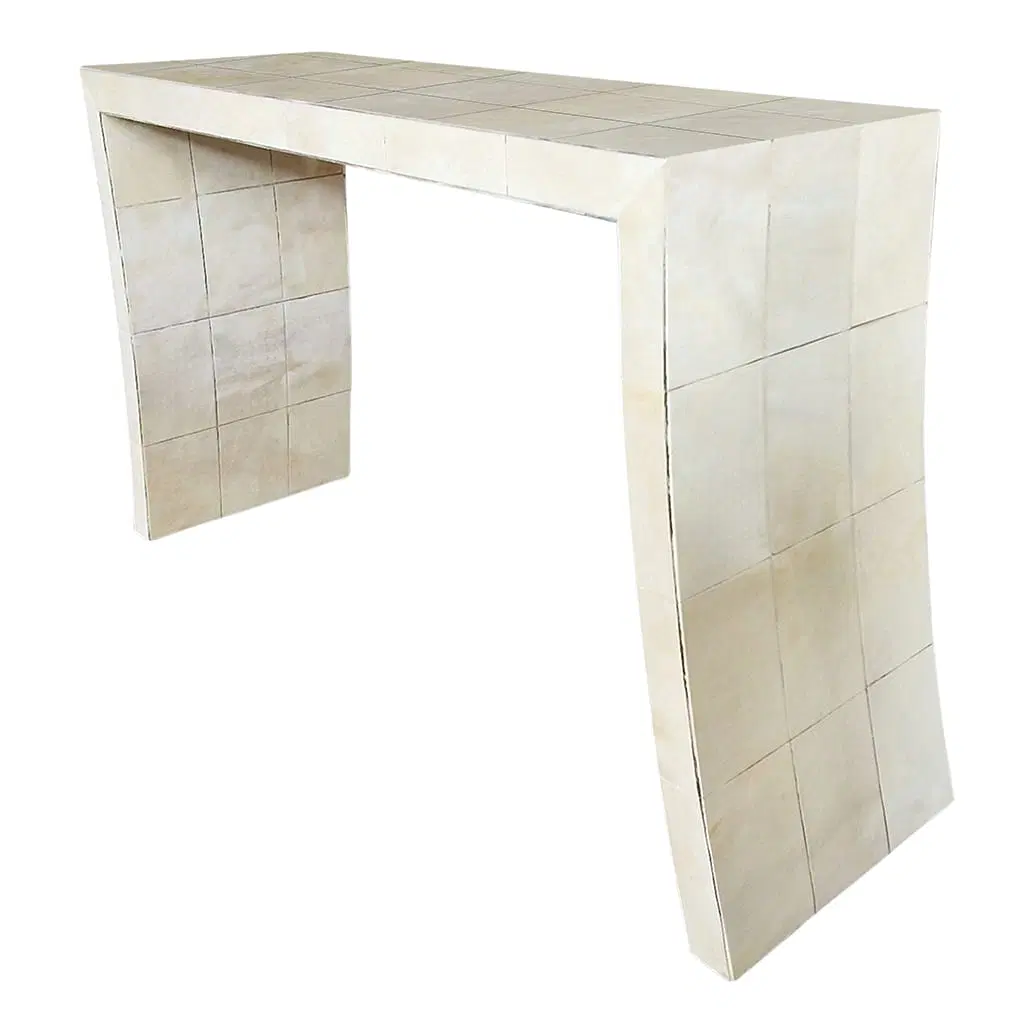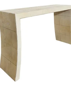 Consolle bifacciale in legno ricoperta in pergamena naturale. Particolare lavorazione a reticolo.