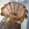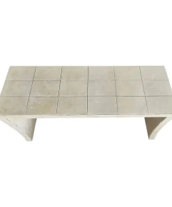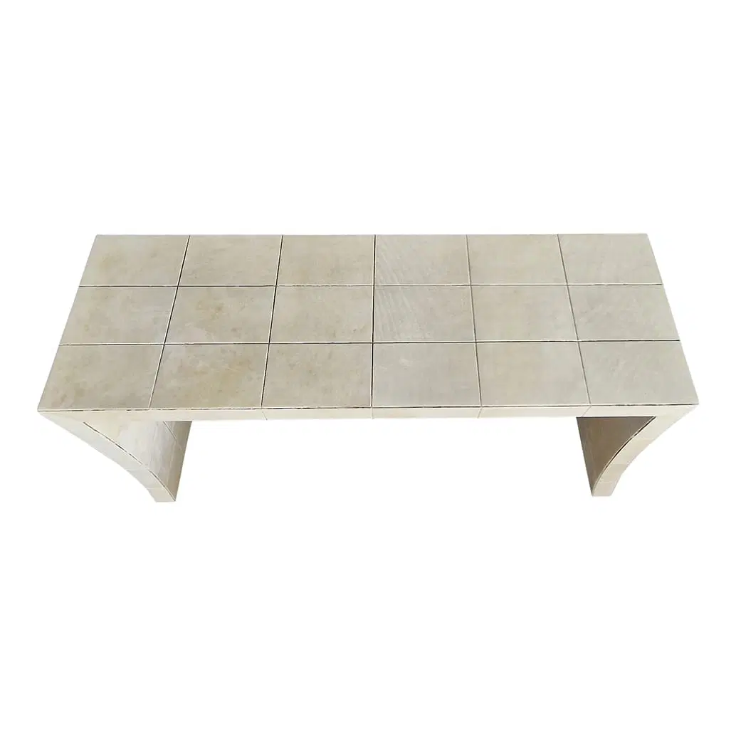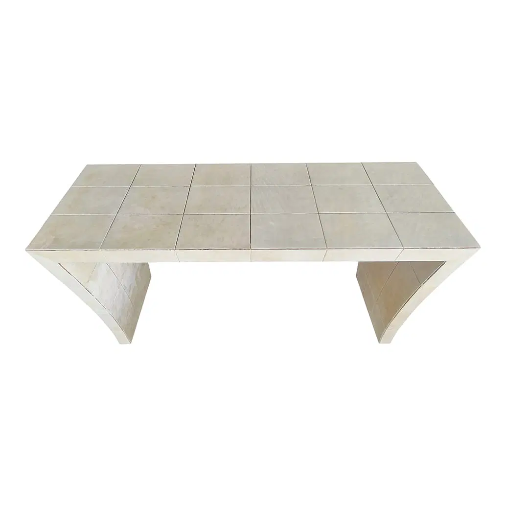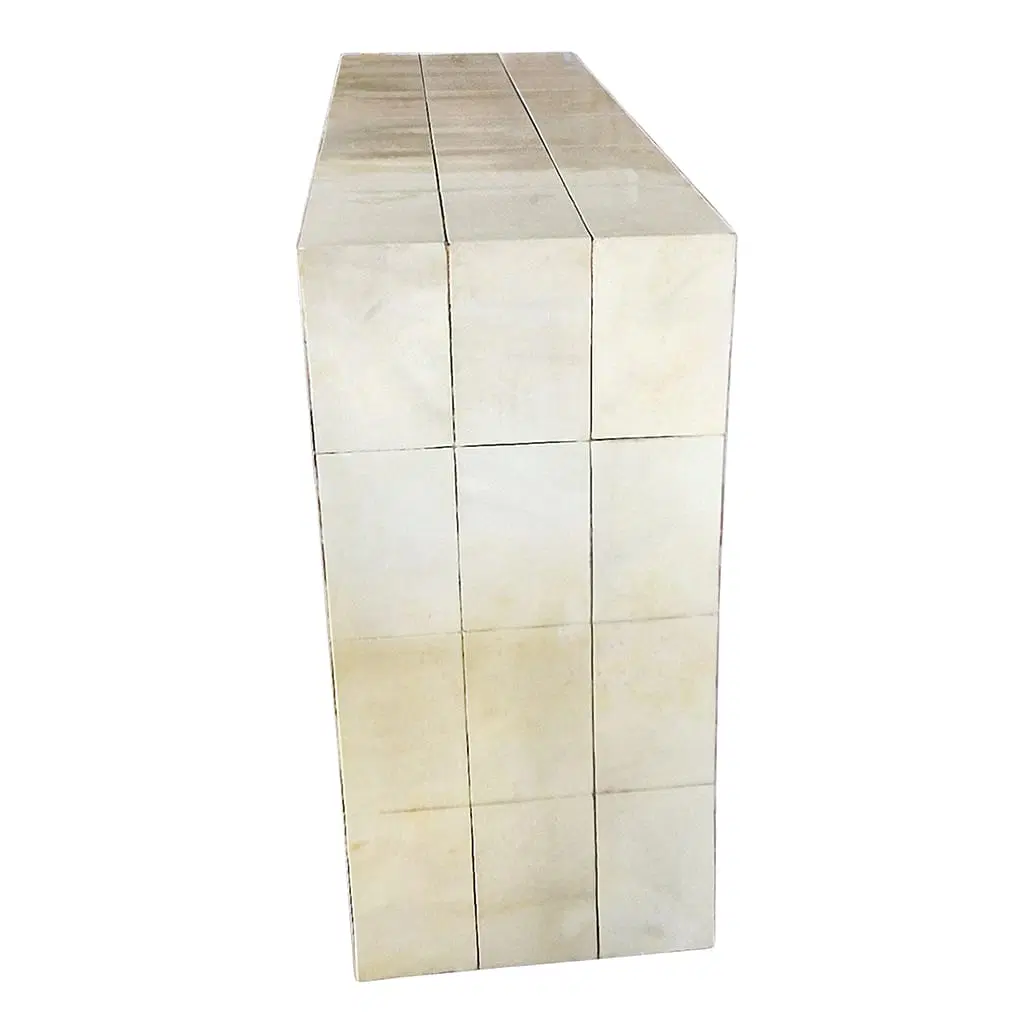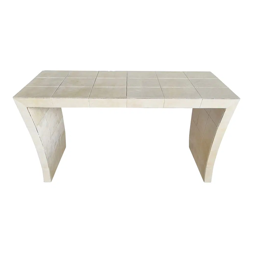 Consolle bifacciale in legno ricoperta in pergamena naturale. Particolare lavorazione a reticolo.