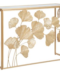 Consolle design da ingresso in metallo dorato con foglie e piano con specchio