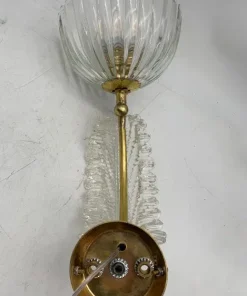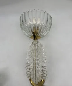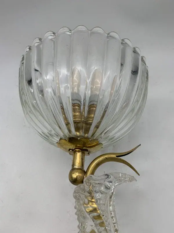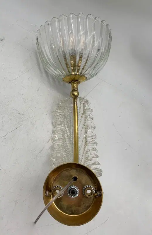 Coppia di appliques in vetro soffiato di Murano, realizzate artigianalmente con braccio curvo trasparente e decorazione a rilievo di ottone, montato su base in metallo con finitura in ottone. Ogni applique presenta una coppa diffusore in vetro rigato trasparente, che ricorda la forma di un fiore aperto o di una conchiglia, all’interno della quale è alloggiata la lampadina. Attacco e 14; impianto elettrico nuovo.