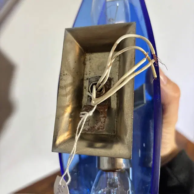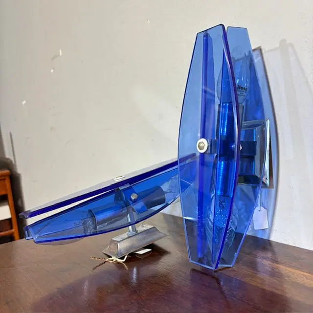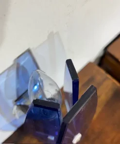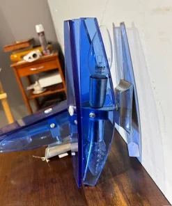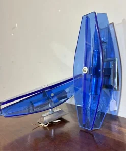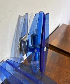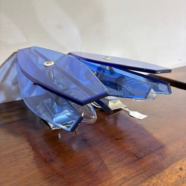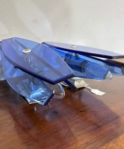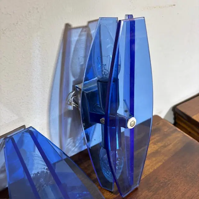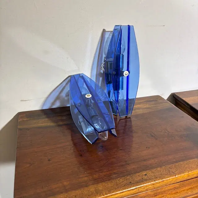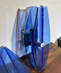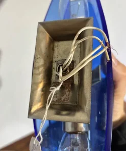 Coppia di applique luci da muro anni 70 in vetro murano blu modernariato – design . Mis 26 x 9. Doppio fascio di luce alto e basso, struttura in metallo cromato . Ottimo stato .