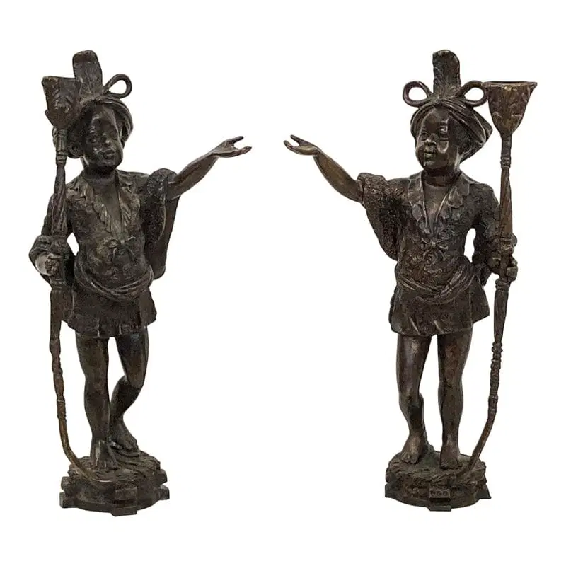 Coppia di Candelieri in Bronzo, fusione a cera persa, raffigurante due Mori Veneziani, risalente alla prima metà del ‘900. Lotto di importante qualità e fattura, considerevole la cura e la precisione per i dettagli, coppia elegante e pregevole. Possono essere adoperati come fermacarte o come semplici soprammobili.