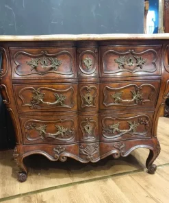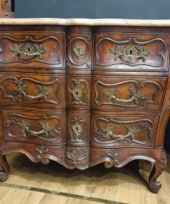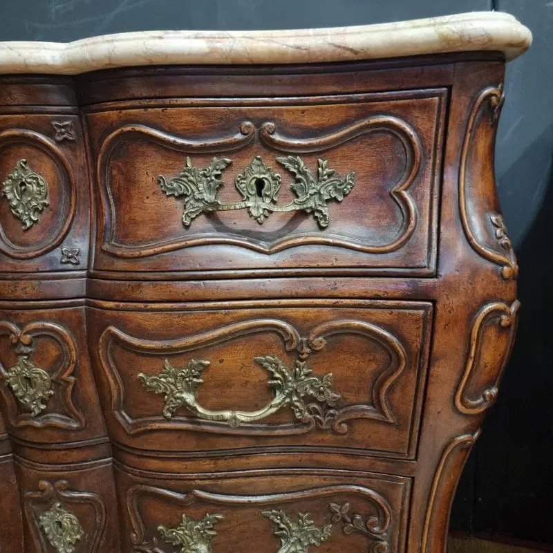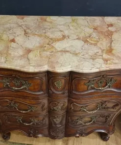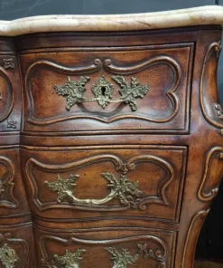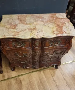 I cassettoni presentano eleganti linee mosse e sinuose, tipiche dello stile Luigi XV, che conferiscono dinamismo e leggerezza all’intero mobile. I marmi rosa Verona originali, perfettamente conservati, aggiungono un tocco di prestigio e raffinatezza, elevando ulteriormente la qualità percepita.