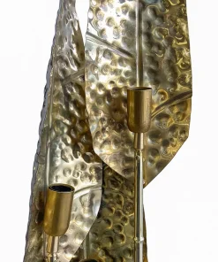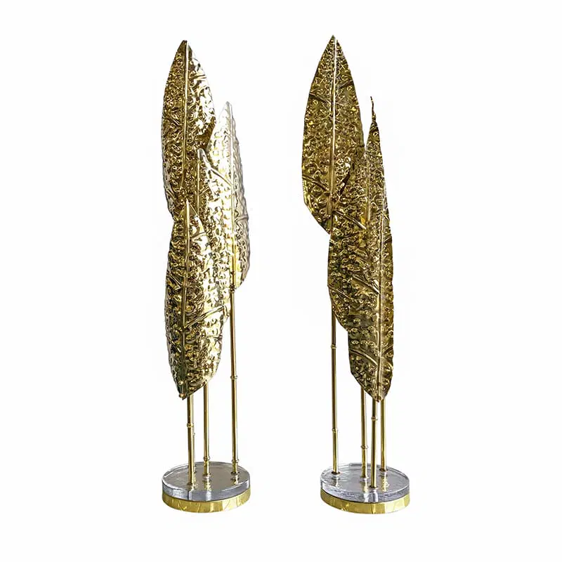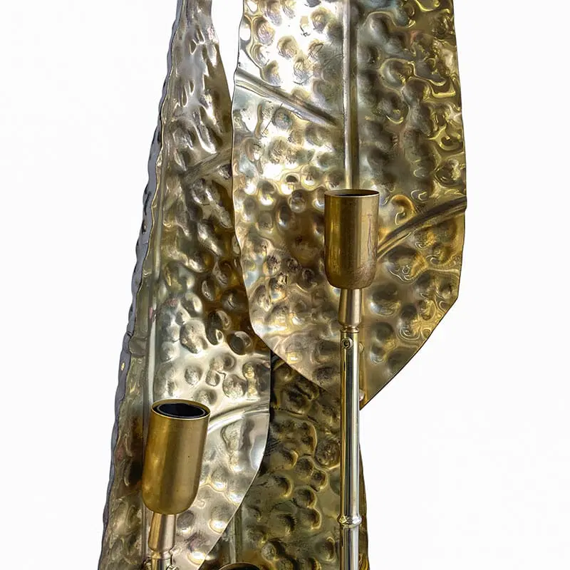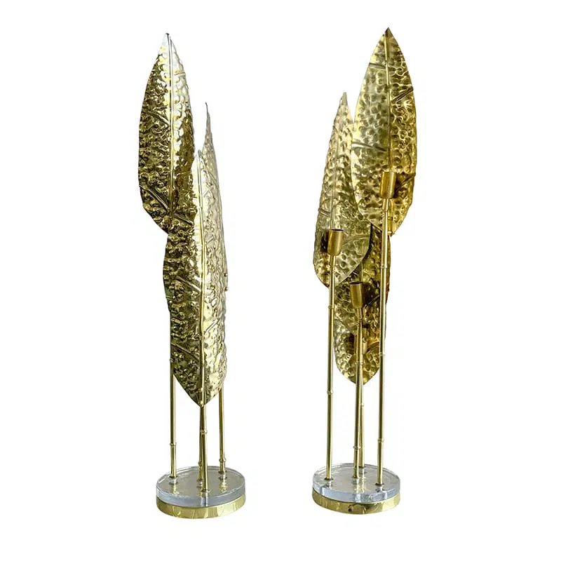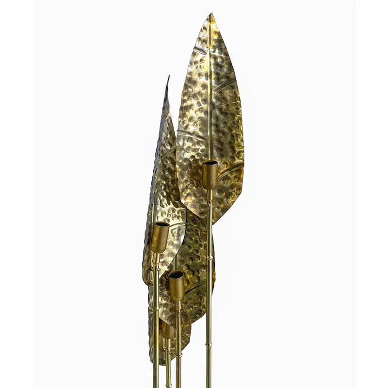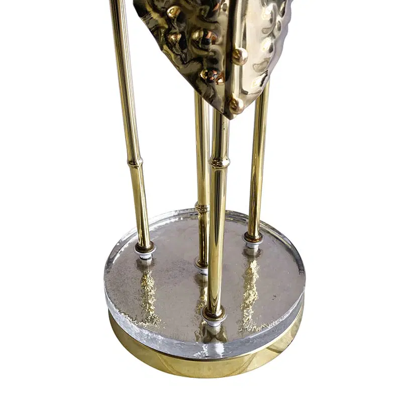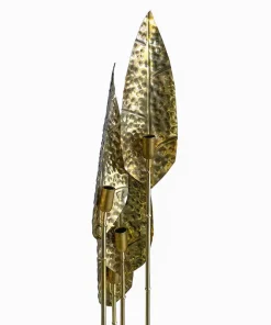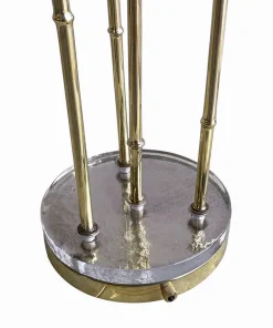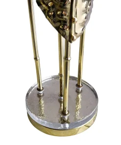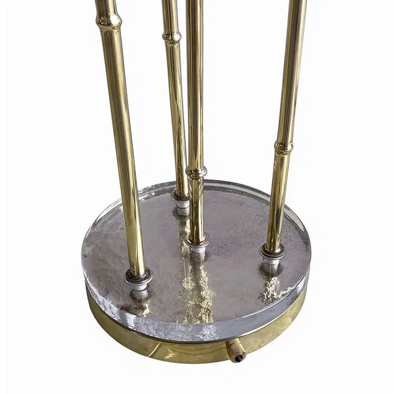 Interamente realizzate in ottone con finitura lucida, queste lampade dal fascino tropicale sono composte da quattro steli di varie lunghezze, ognuno dei quali è dotato di un porta lampade per lampadine E14 all’estremità superiore e una foglia finemente lavorata. La base è composta da un disco in ottone sormontato da un elemento circolare in vetro trasparente.