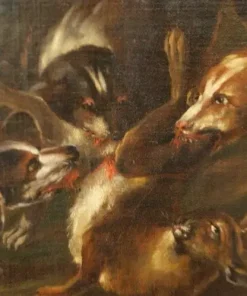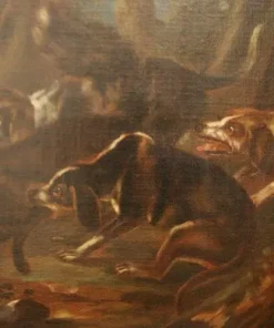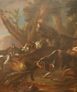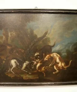Coppia di oli su tela italiani del 1600, raffiguranti scene di caccia. Cornici coeve.