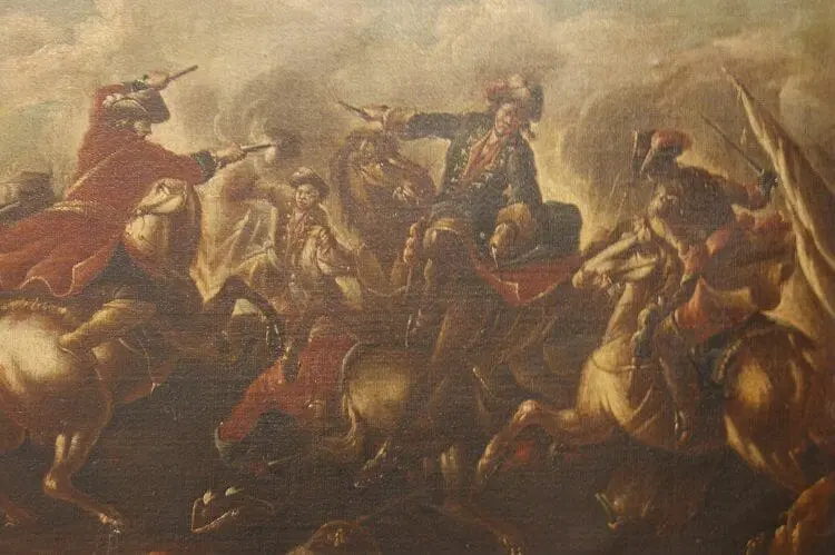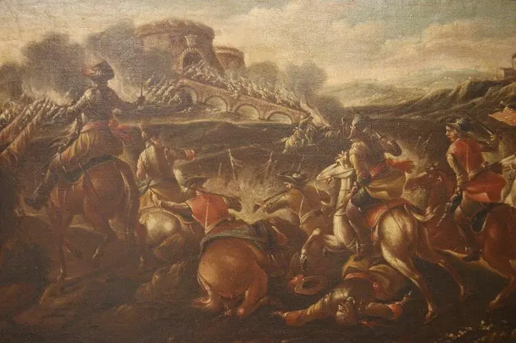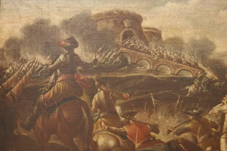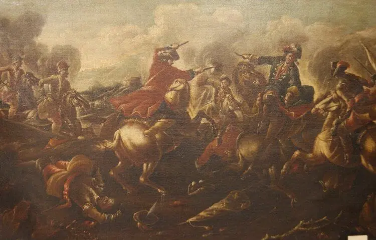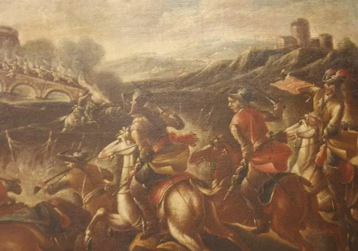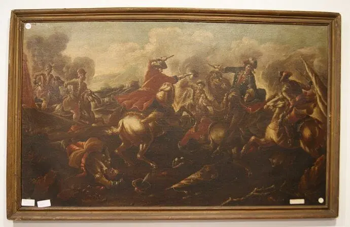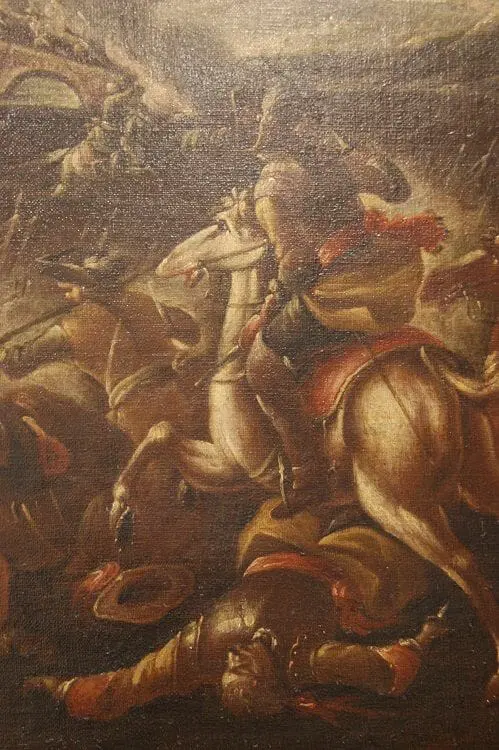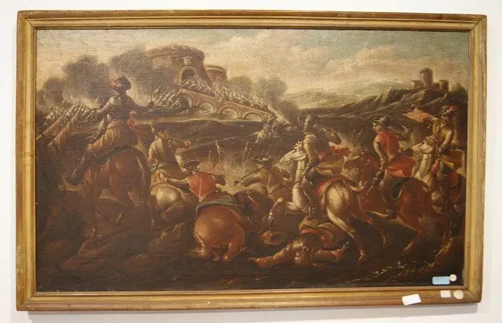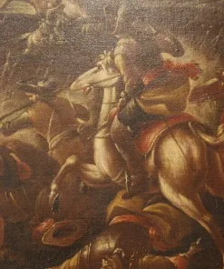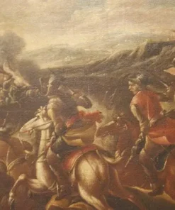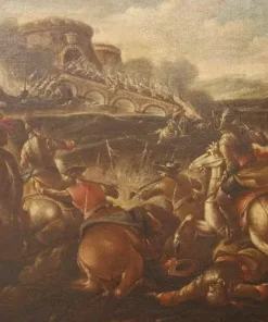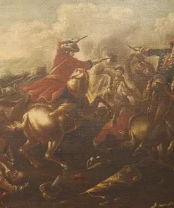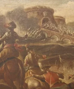 Coppia di oli su tela italiani della seconda metà 1600 raffiguranti Battaglia. Rappresentati cavalieri in sella a cavalli che combattono con spade ed armi da fuoco, ritratti anche corpi esamini di soldati ai piedi della tela con fortificazioni sullo sfondo delle due tele.