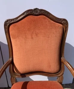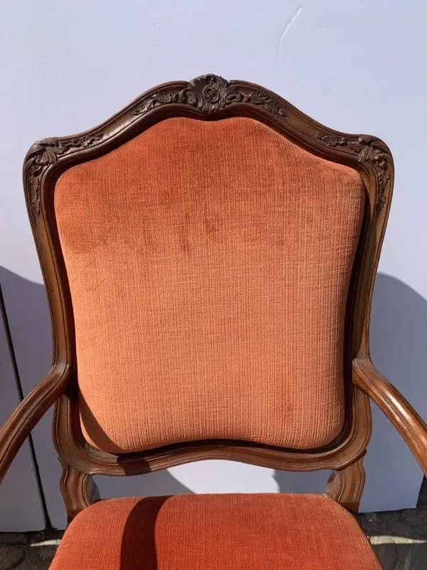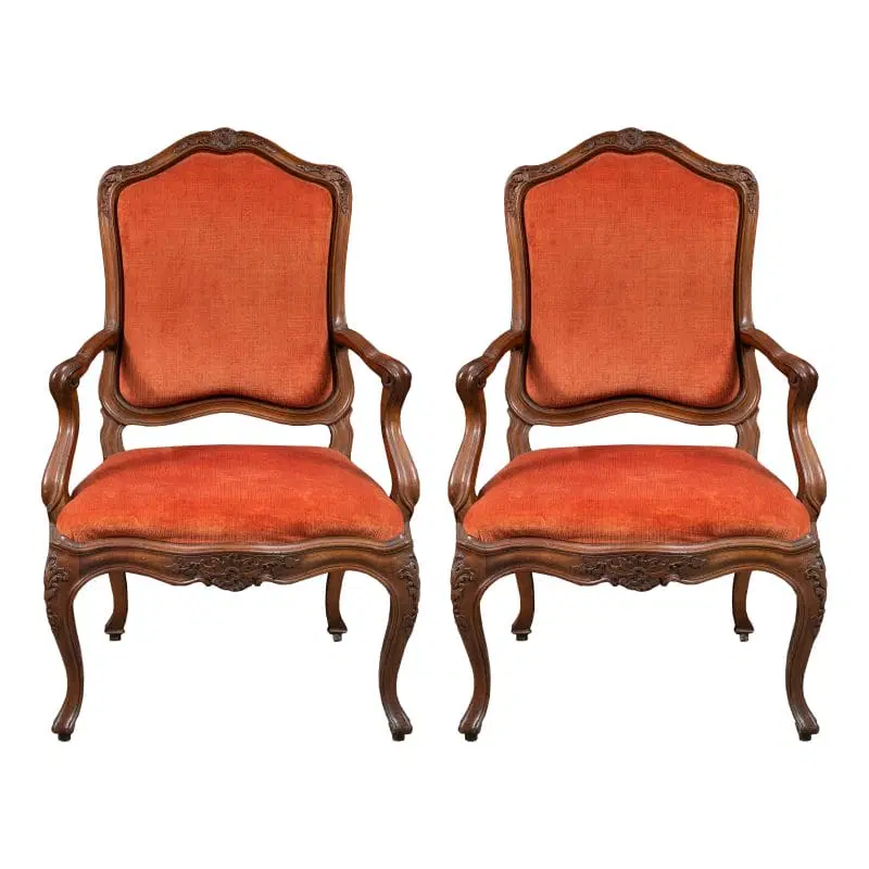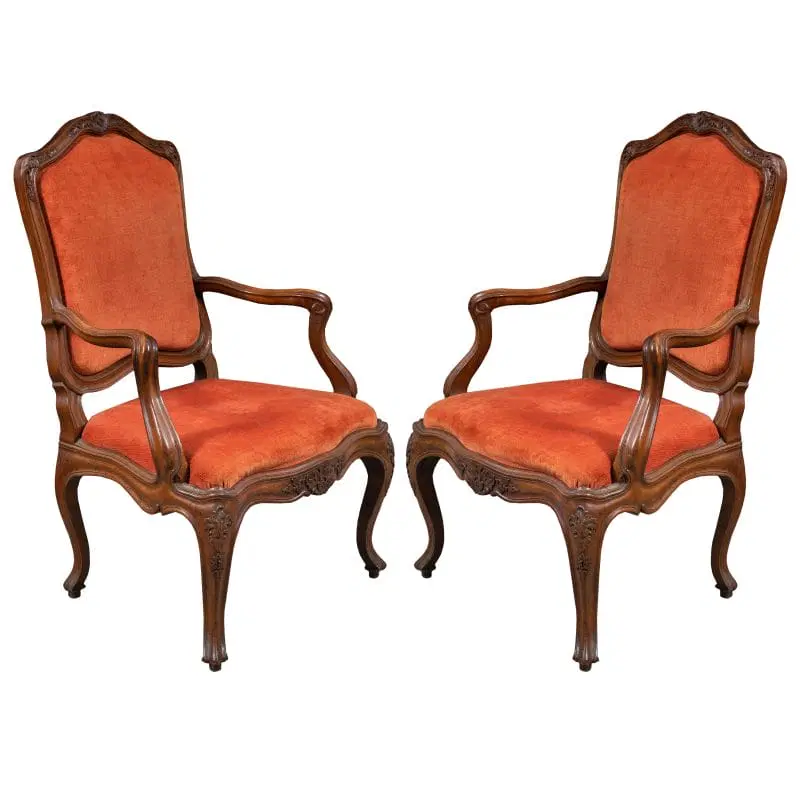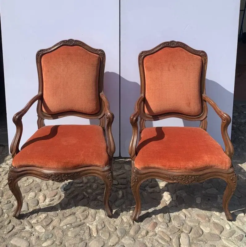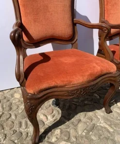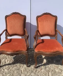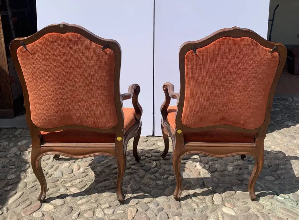 Interamente in legno di noce finemente intagliato a motivi rocaille, rivestite in tessuto rosso in buone condizioni.