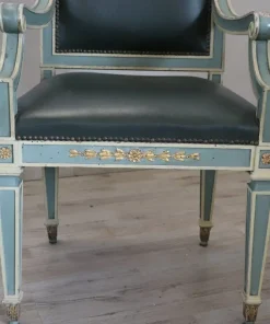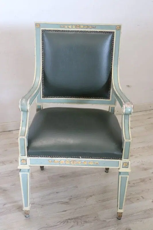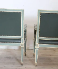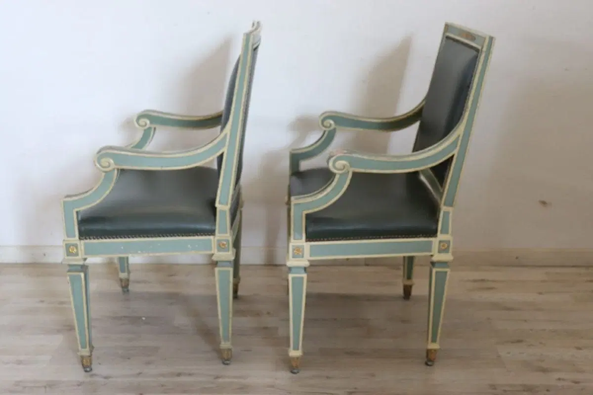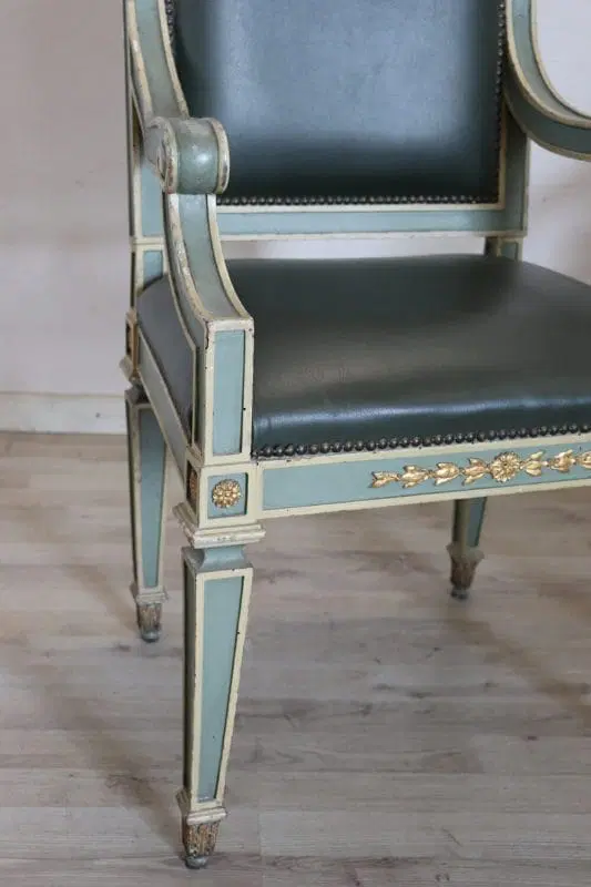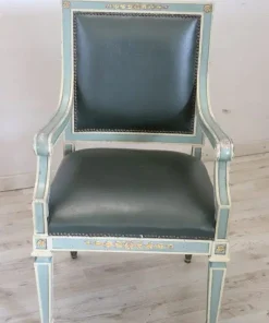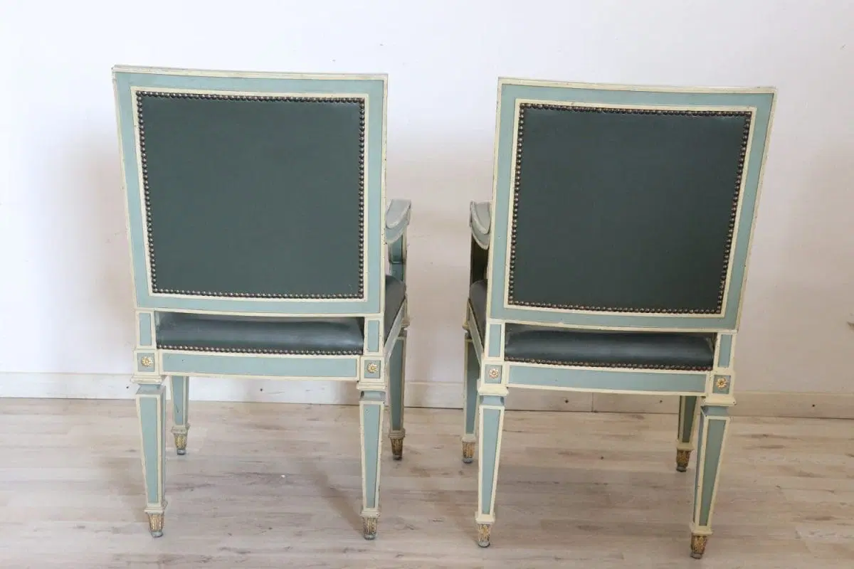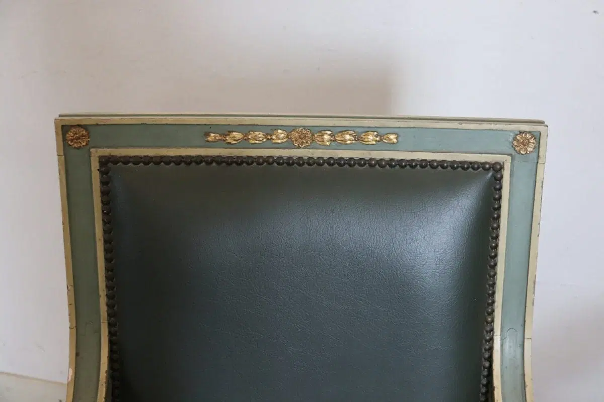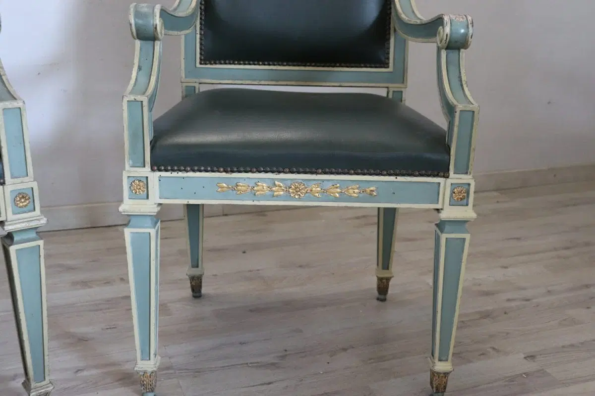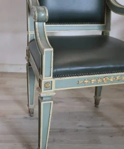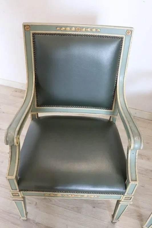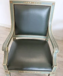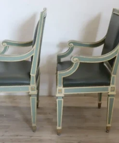 Grazioso set di 2 poltrone primi decenni secolo XX. Queste poltrone sono in stile Luigi XVI in legno laccato con raffinate decorazioni dorate. Rivestite in similpelle verde. Questa bella coppia di poltrone ha una forma molto lineare e una seduta confortevole. Si segnala segni di usura nella laccatura e fori da tarlo. Proposta ad un’ottimo prezzo comunque trattabile vi invitiamo ad inviarci le vostre proposte di acquisto le valuteremo con piacere.