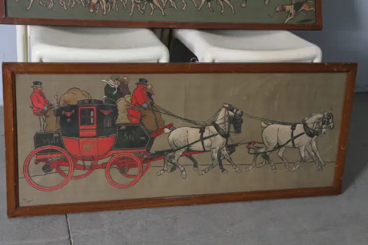 Antica coppia di stampe acquerellate raffiguranti carrozze con personaggi e cavalli. Firmate in basso a sinistra dall’ artista. Di grande arredo . Ottimo stato Mis : 105 x 44