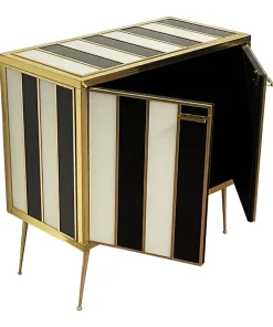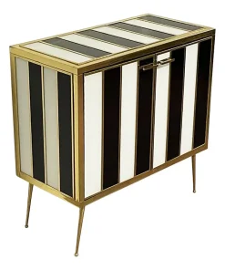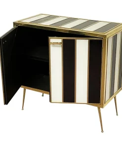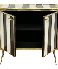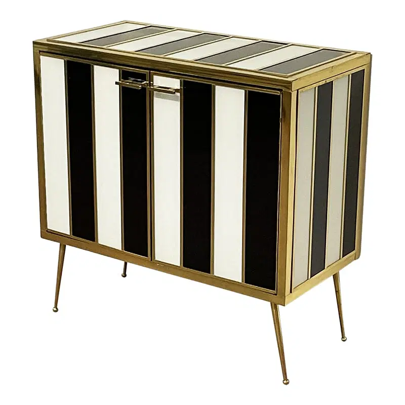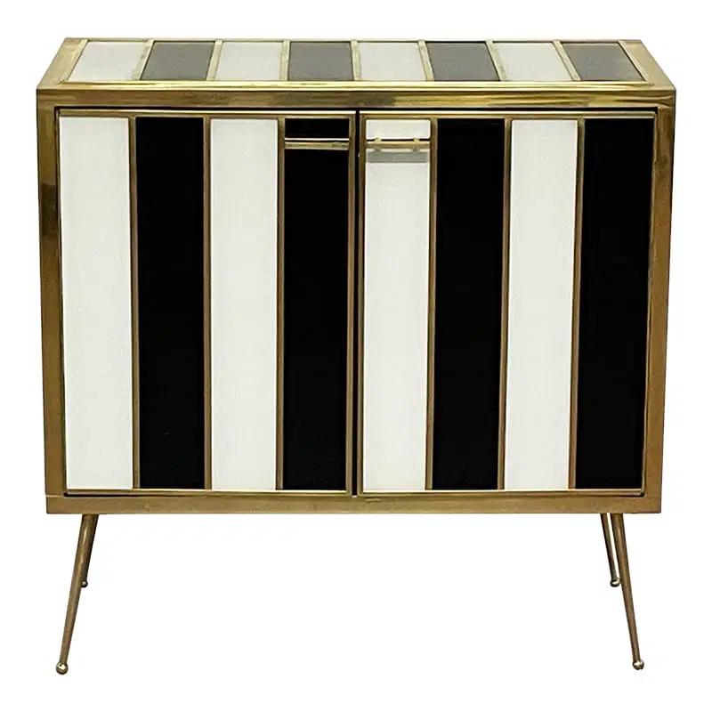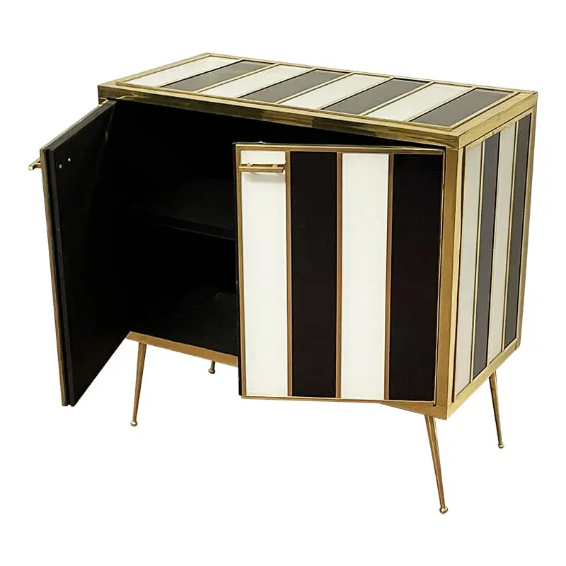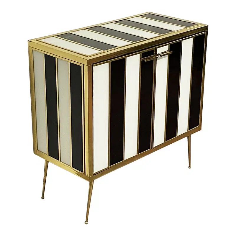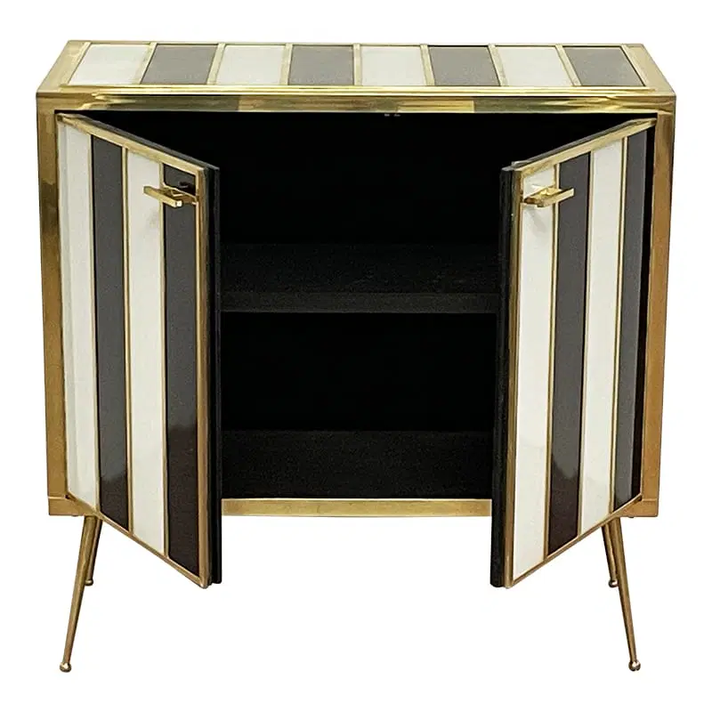 Credenza a due ante, dotata di ripiano interno, interamente realizzata a mano, con struttura in legno, ricoperto in vetro bianco e nero; profili, finiture maniglie e piedi in ottone dorato.