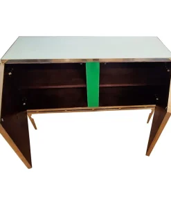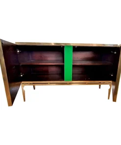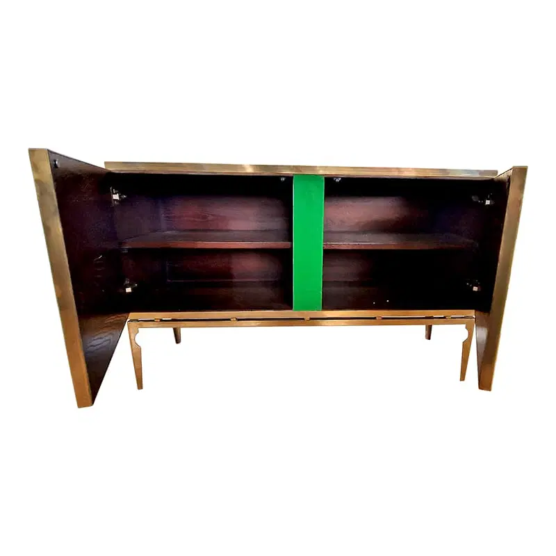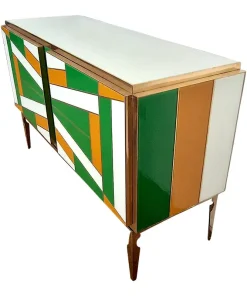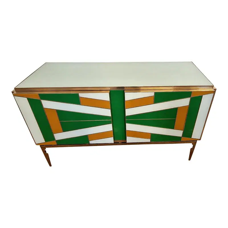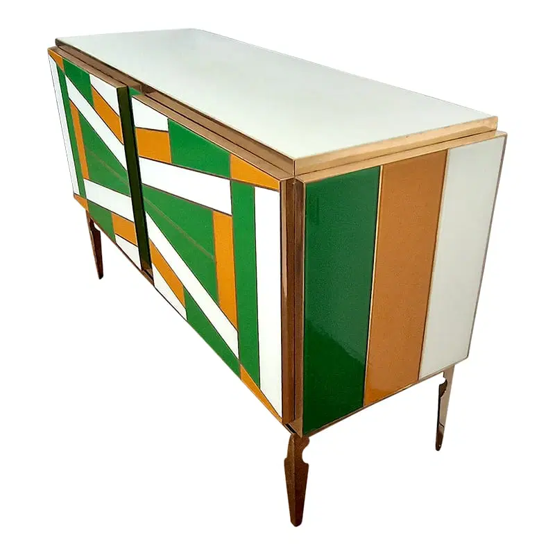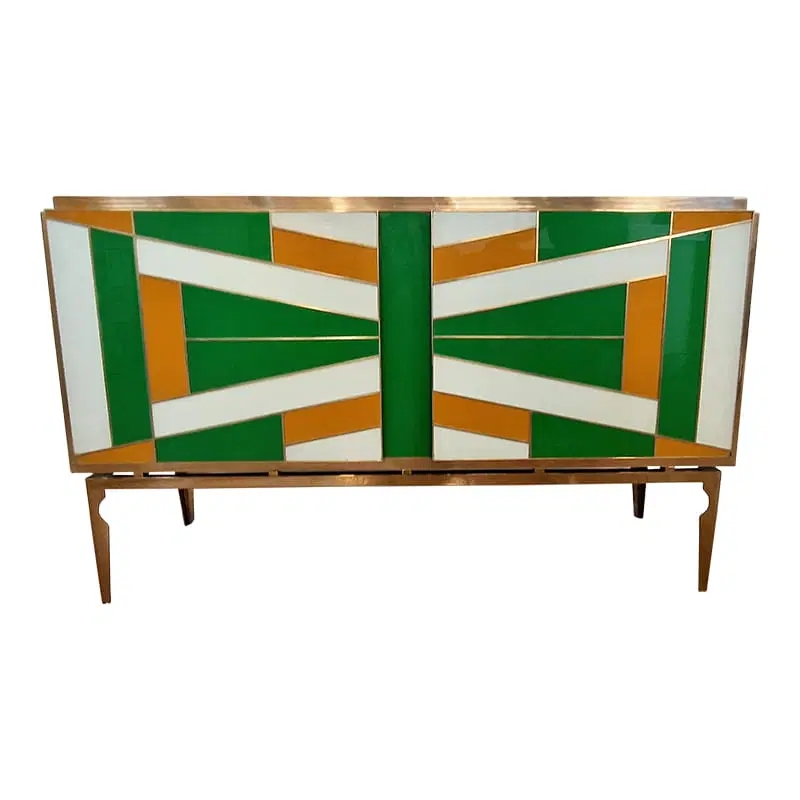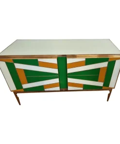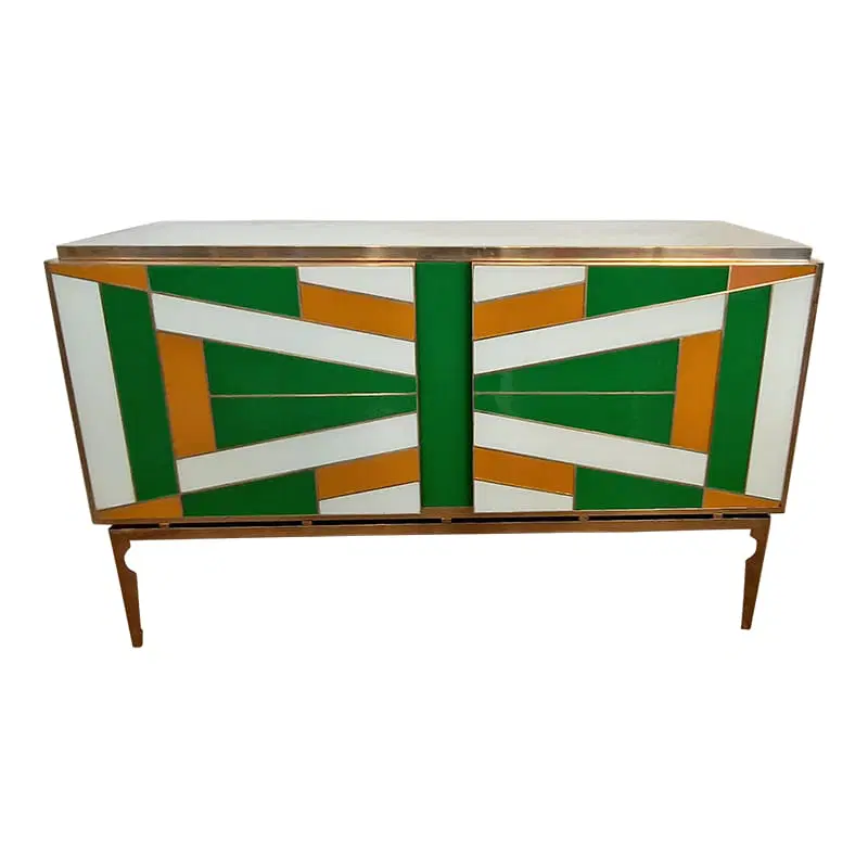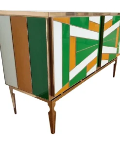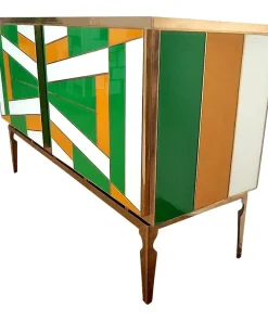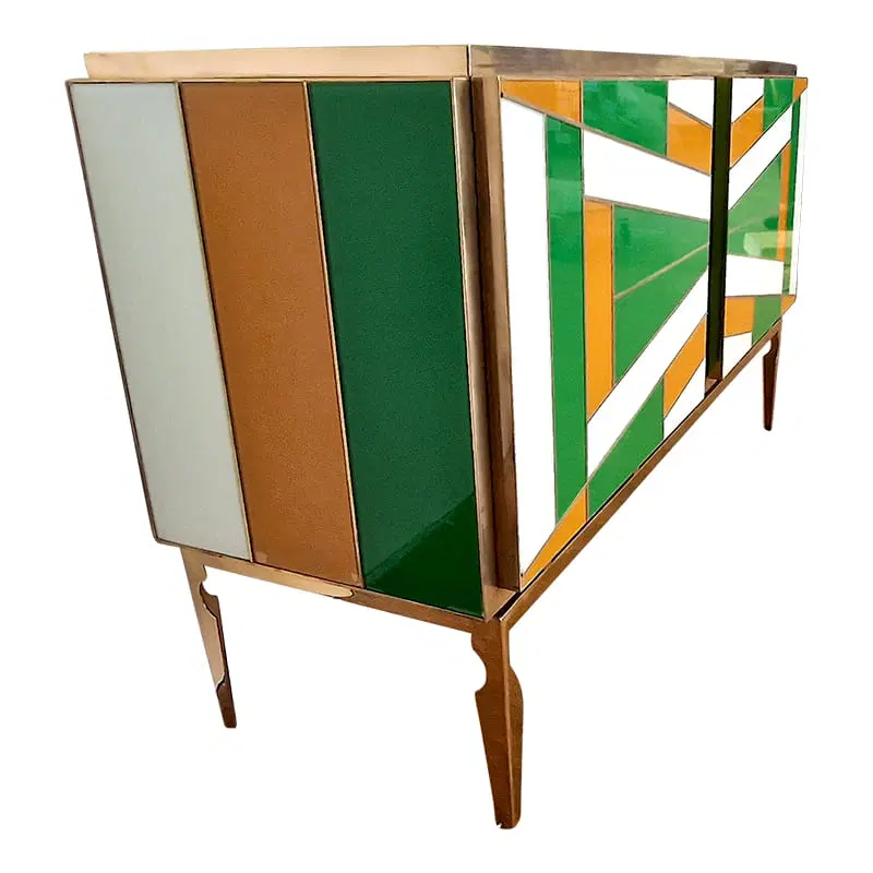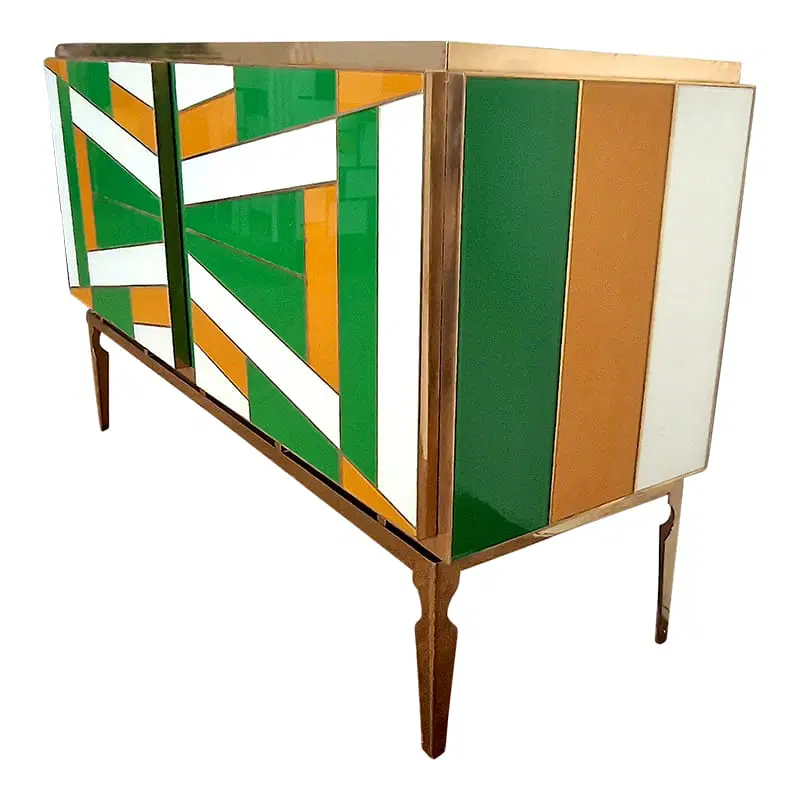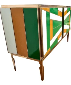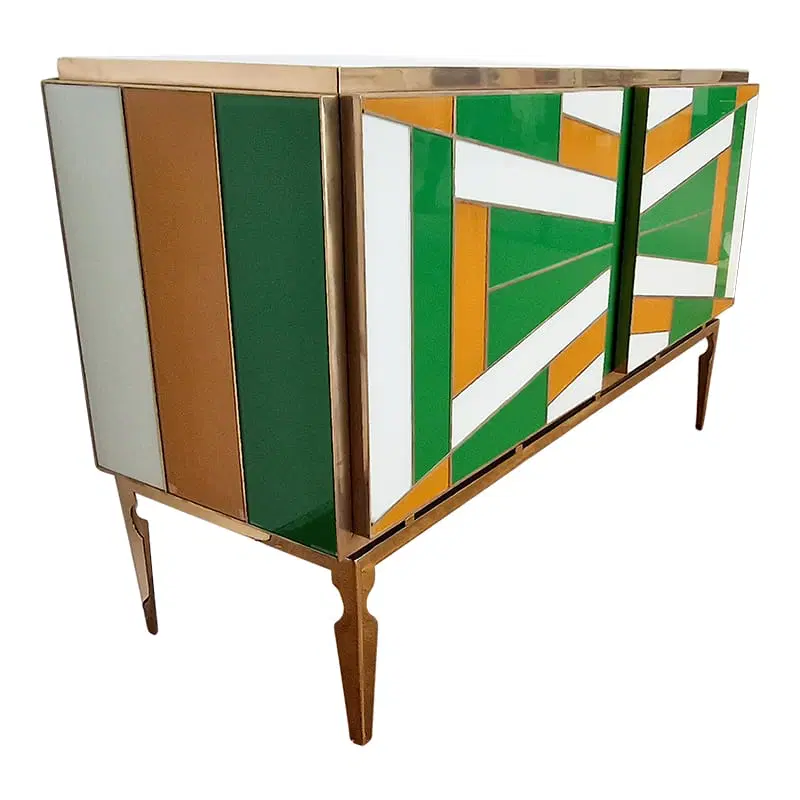 Credenza due ante e ripiano interno, interamente realizzata a mano, con struttura in legno rivestita in vetro verde, arancio, bianco; profili, piedi in ottone dorato. Ante push pull.