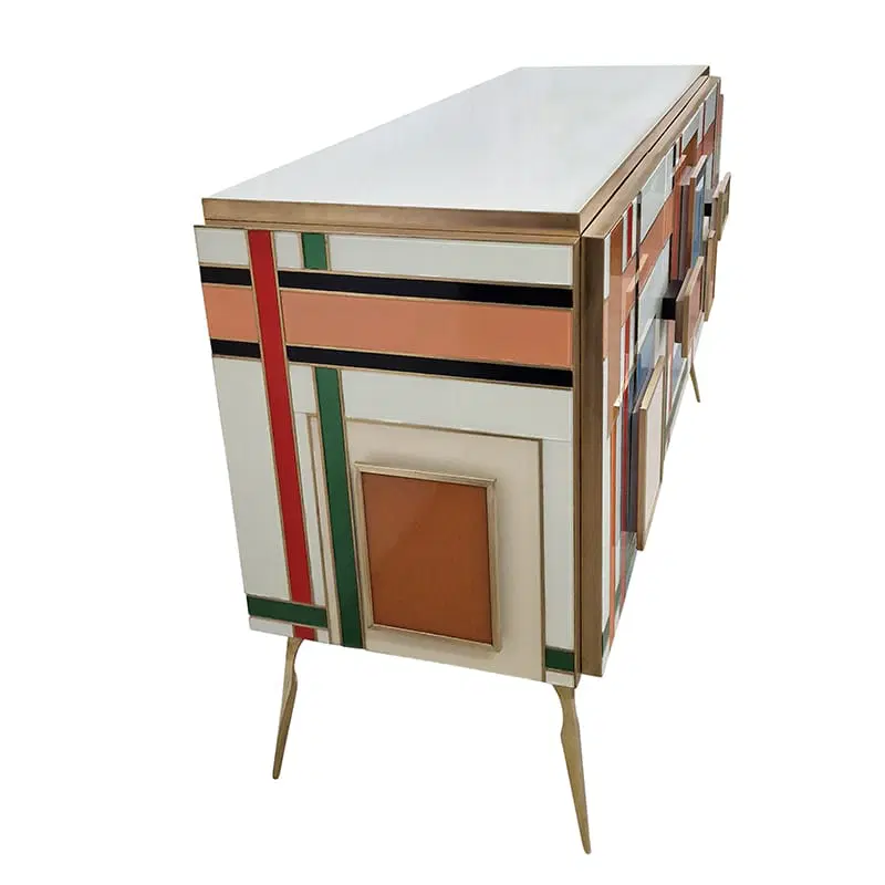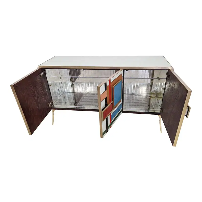 Credenza a tre ante a vetri colorati e due vani interni; profili e piedi in ottone