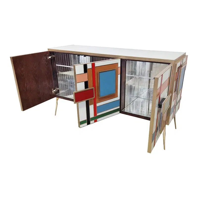 Credenza interamente realizzata a mano, con tre ante e due vani interni, ciascuno rivestito a specchio e dotato di un ripiano interno in vetro trasparente, struttura in legno rivestita con inserti di vetro multicolore, strip led per illuminazione a perimetro degli elementi sporgenti e delle maniglie; profili e piedi in ottone.