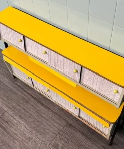 Dispone di piccole antine a scorrimento e di 3 cassetti.