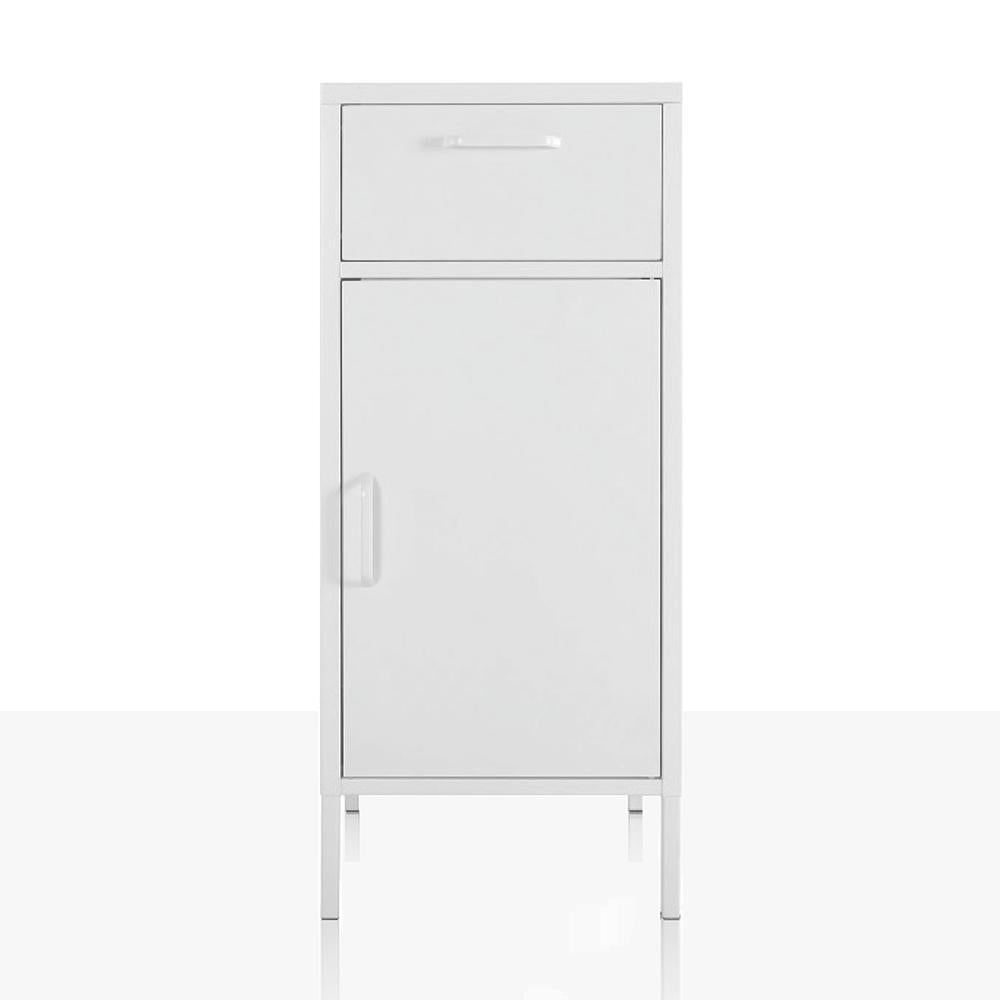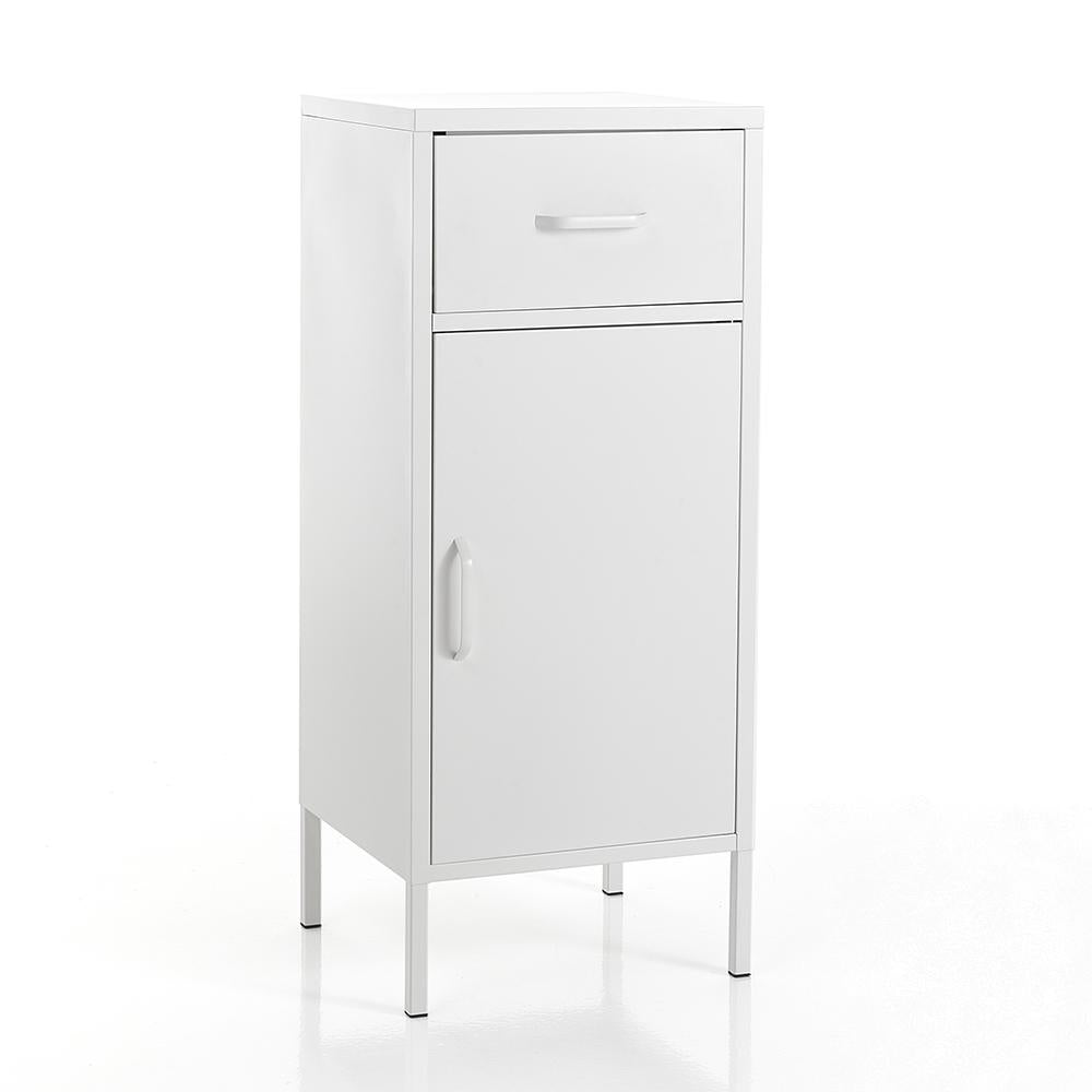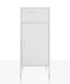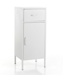 Credenza di stile industrial realizzata interamente in acciaio laccato bianco opaco e dotato di un cassetto contenitore per ogni tipo di oggettistica e di un vano accessibile attraverso l’utilizzo di un’anta a battente. La composizione presenta un design molto semplice dove il bianco che colora tutta la struttura spicca con la sua opalescenza creando un elemento capace di adattarsi ovunque con qualsiasi genere di arredamento.