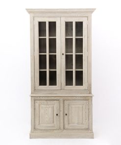 Spaziosa credenza alta con vetrina dotata di due ante semplici in basso e due ante vetrate nella parte superiore rifinite con graziose finestrelle. Il nostro mobile da cucina riflette il valore di un prodotto di alta qualità, grazie alla struttura massiccia in legno massello di abete cerato a mano e alla lavorazione ricca di dettagli, tipici di un mobile classico.