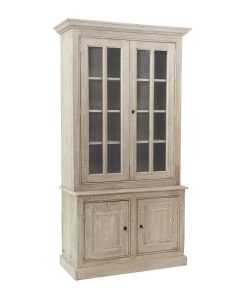 Spaziosa credenza alta con vetrina dotata di due ante semplici in basso e due ante vetrate nella parte superiore rifinite con graziose finestrelle. Il nostro mobile da cucina riflette il valore di un prodotto di alta qualità, grazie alla struttura massiccia in legno massello di abete cerato a mano e alla lavorazione ricca di dettagli, tipici di un mobile classico.