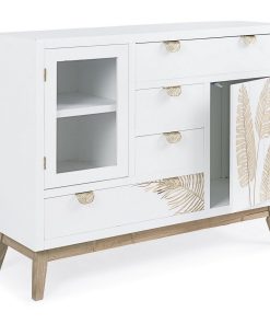 Credenza con ante, 4 cassetti, anta battente e1 anta vetrata, tutto realizzato in legno colore bianco decorato con graziose foglie tropicali. Il nostro mobile ti aiuterà a tenere in ordine il soggiorno e contribuisce a creare un arredamento luminoso e giovanile.