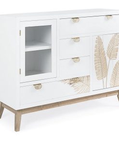 Credenza con ante, 4 cassetti, anta battente e1 anta vetrata, tutto realizzato in legno colore bianco decorato con graziose foglie tropicali. Il nostro mobile ti aiuterà a tenere in ordine il soggiorno e contribuisce a creare un arredamento luminoso e giovanile.