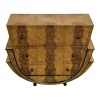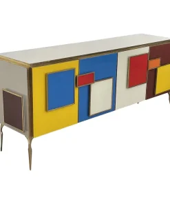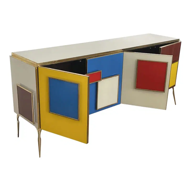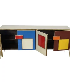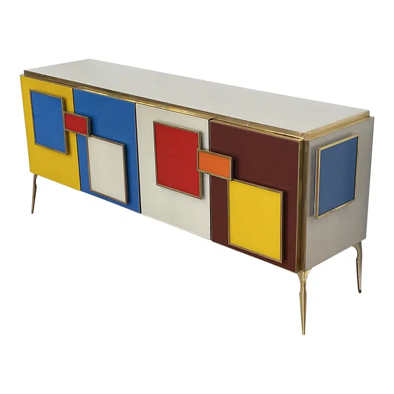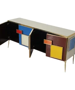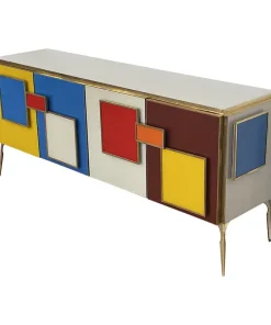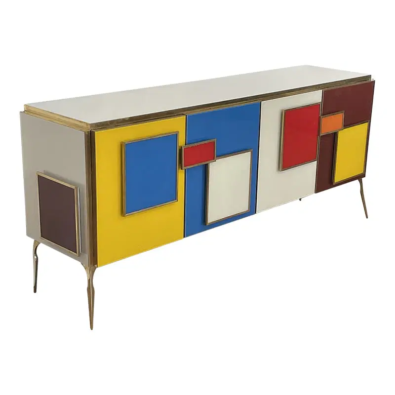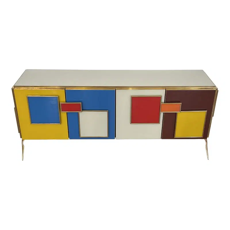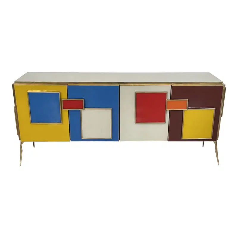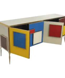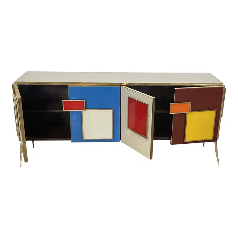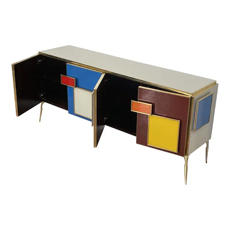 Credenza a quattro ante e un ripiano interno, interamente realizzata a mano, con struttura in legno rivestita in vetro multicolor; profili, maniglie e piedi in ottone dorato.
