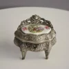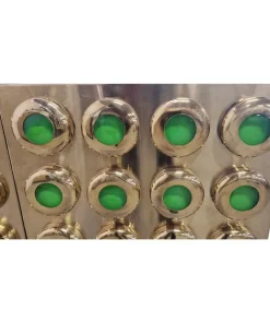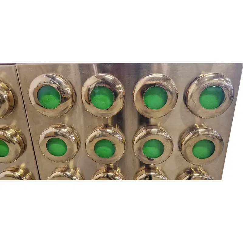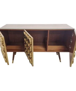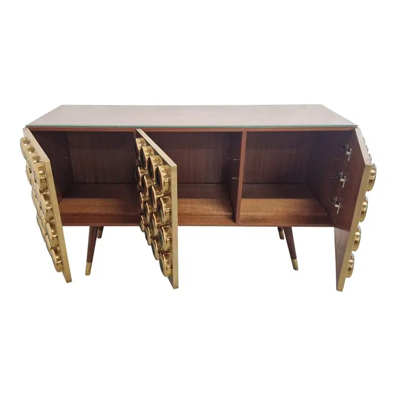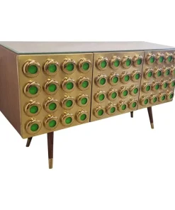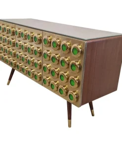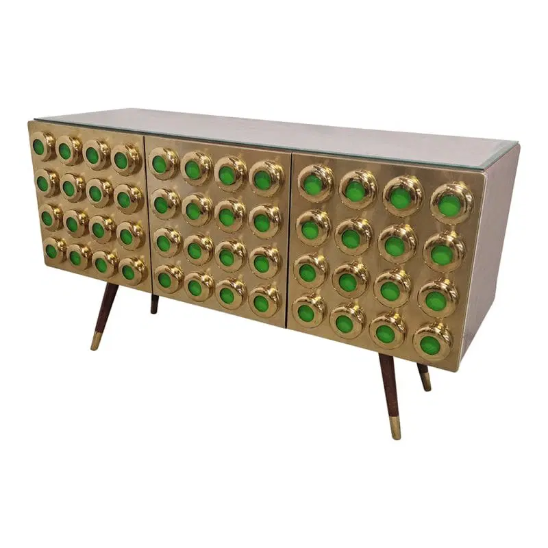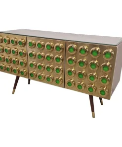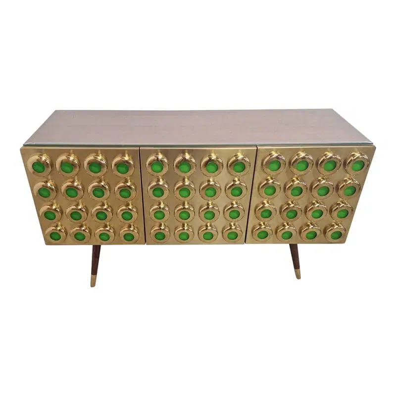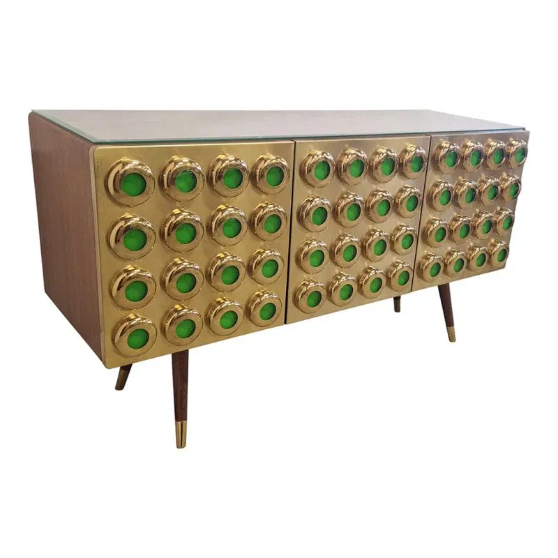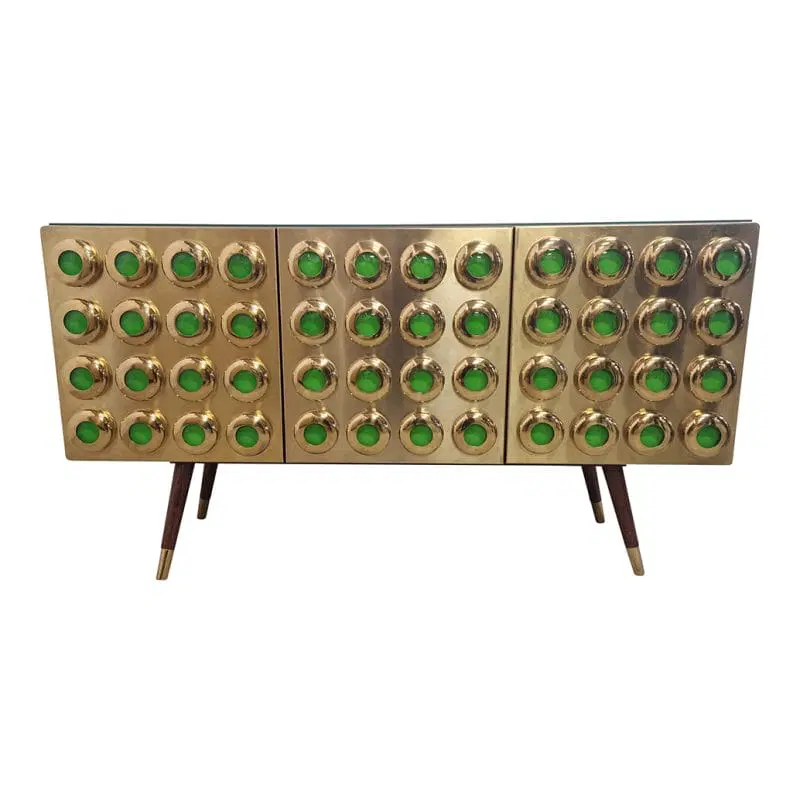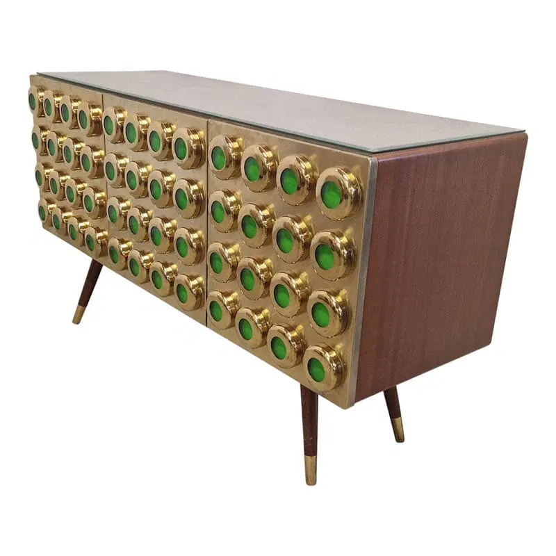 Credenza interamente realizzata a mano con struttura in legno e rivestita in ottone con decori a cerchio di vetro verde. Dotata di tre ante e un ripiano interno.