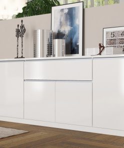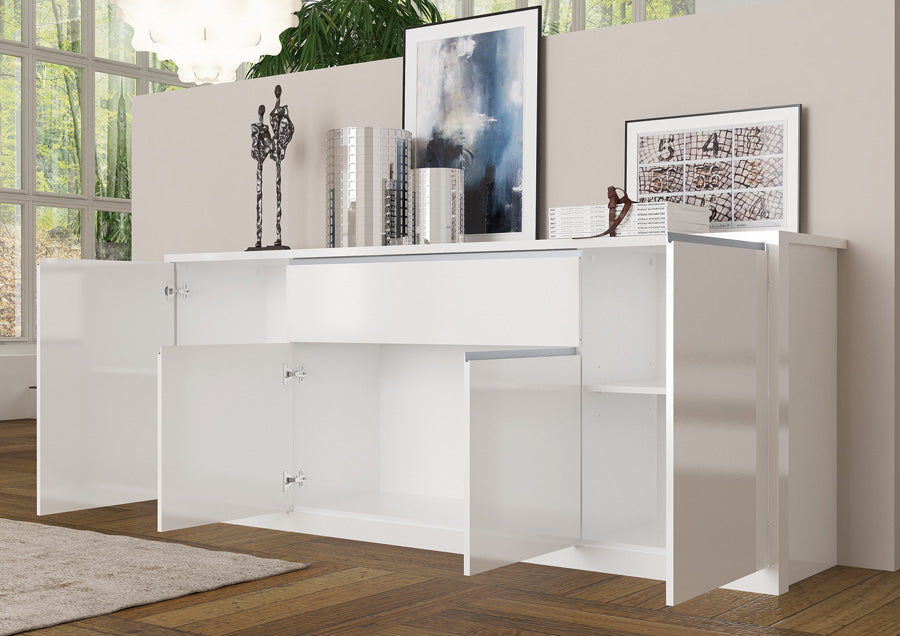 Madia buffet in legno, colore bianco lucido, con 4 ante e cassetto. Perfetta per la sala da pranzo o soggiorno, il mobile garantisce eleganza e modernità, praticità e qualità, grazie anche ai suoi ottimi materiali, prodotti dai nostri bravi artigiani italiani. Una novità Made in Italy da non perdere!