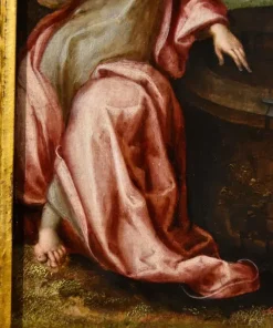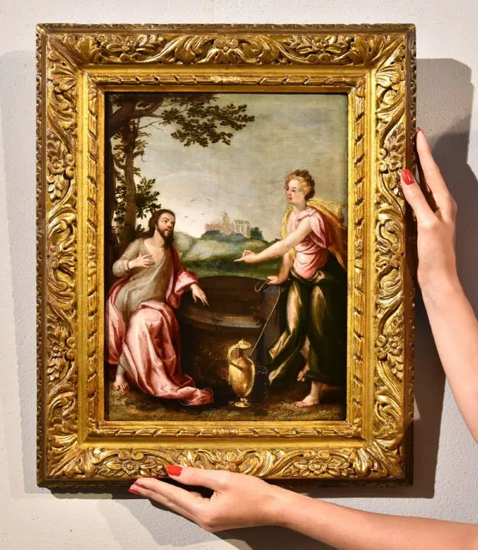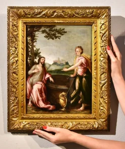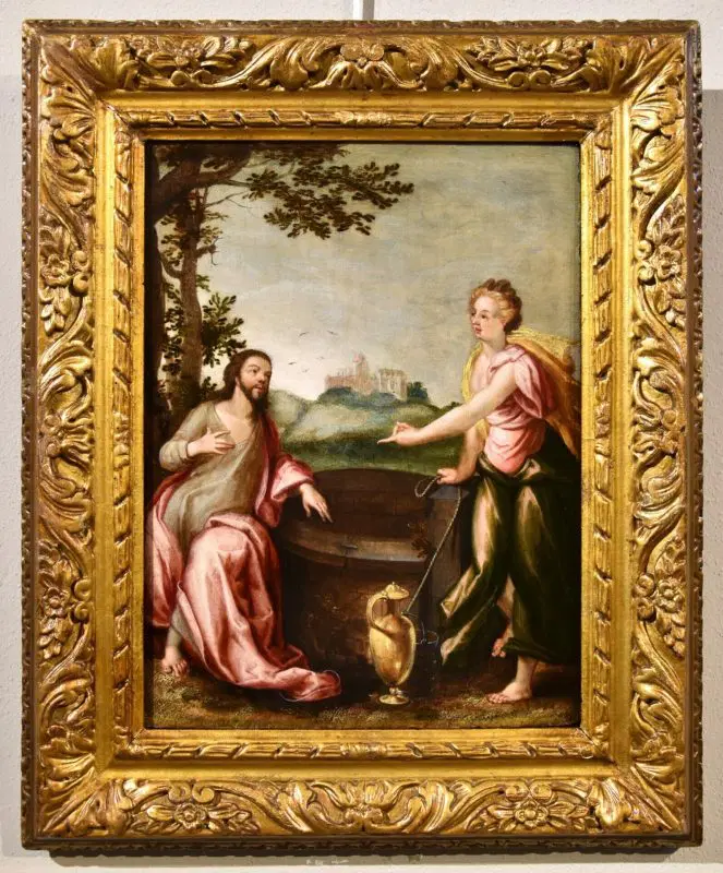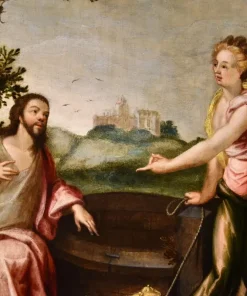 Il soggetto illustrato in questo raffinato dipinto è tratto dal Vangelo di Giovanni (4, 6-10), dove si racconta di Gesù che stanco dal viaggio verso la Galilea, chiese a una Samaritana, notoriamente avversa ad un giudeo, di offrirgli da bere l’acqua del pozzo di Giacobbe, promettendole in cambio ‘un’acqua in grado di dissetarla per l’eternità’.