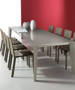 Interessante tavolo da pranzo Cruz di Bontempi, dal design lineare e altamente funzionale e pratico. La presenza di 2 allunghe riposte sotto il piano infatti, permettono una immediata e agevole trasformazione, ottenendo un piano di cm 220.