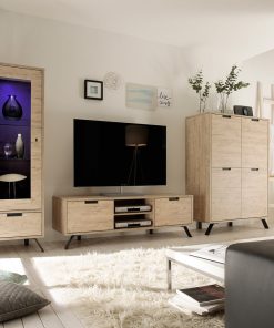 Vetrina moderna Dakota, caratterizzata da ripiani in vetro e una particolare finitura sherwood oak, una caratteristica che conferisce una nota country al proprio arredamento. Da correlare con ulteriori mobili della stessa linea per il soggiorno o salotto.