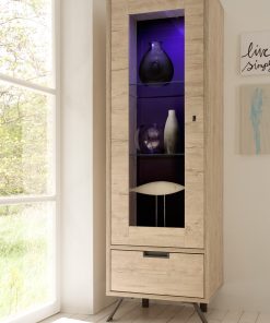 La vetrina moderna Dakota si compone di anta con vetro e ripiani interni in vetro, con luci a ed opzionali, a questo si aggiungono dettagli distintivi come i piedi in ferro dalla linea obliqua e maniglie incastonate.
