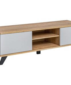 Mobile basso porta tv Dalciso, con 2 ante a ribalta e vani centrali, prodotto in legno con struttura rovere chiaro e frontali e laterali grigio chiaro.