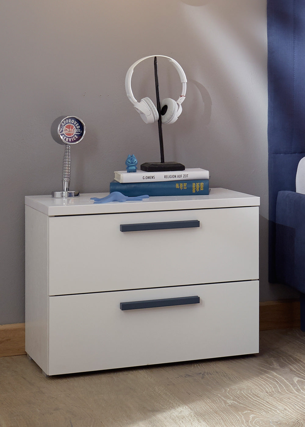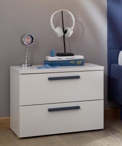 Comodino da camera con 2 cassetti realizzato in legno bianco opaco con maniglie lineari, disponibili in 5 varianti: bianco come la struttura o colorate come artico, blu