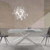 Dalmiro è progettato per estendersi fino a dimensioni mai viste, infatti, le due versioni proposte prevedono un allungamento fino a cm 360 o addirittura fino a cm 500, con allunghe riposte sotto il piano. Il design del tavolo moderno Dalmiro si caratterizza per le gambe ad X che si potranno sdoppiare per garantire stabilità al tavolo anche nella sua massima estensione.
