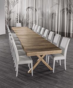 Dalmiro è progettato per estendersi fino a dimensioni mai viste, infatti, le due versioni proposte prevedono un allungamento fino a cm 360 o addirittura fino a cm 500, con allunghe riposte sotto il piano. Il design del tavolo moderno Dalmiro si caratterizza per le gambe ad X che si potranno sdoppiare per garantire stabilità al tavolo anche nella sua massima estensione.