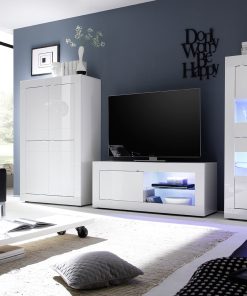 Graziosa vetrina moderna in legno bianco lucido, definita da forme basic con una struttura solida e spaziosa con 4 ripiani interni e due ante. Il mobile da soggiorno Darla si rivelerà funzionale ed esteticamente allettante, con la possibilità di integrare luci a led, per chi apprezza questo grazioso elemento decorativo, creando una luce soft ed un aspetto più contemporaneo.