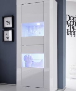 Graziosa vetrina moderna in legno bianco lucido, definita da forme basic con una struttura solida e spaziosa con 4 ripiani interni e due ante. Il mobile da soggiorno Darla si rivelerà funzionale ed esteticamente allettante, con la possibilità di integrare luci a led, per chi apprezza questo grazioso elemento decorativo, creando una luce soft ed un aspetto più contemporaneo.