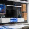 Parete componibile Deanira formata da pensili sospesi, combinati tra loro in modo da generare elementi pratici e graziosi, con ante vetrate e luci a led colore blu.