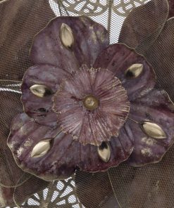 Pannello da parete ampio ed appariscente, facente parte di una serie di pannelli che presentano fiori come soggetto con colori caldi del rosso accompagnato dal colore oro. Questo panello design nello specifico, esibisce un delicato fiore carico di dettagli, con bellissime foglie realizzate a traforo e plisettate, tutto frutto dell’elaborazione del metallo con effetto antichizzato.