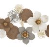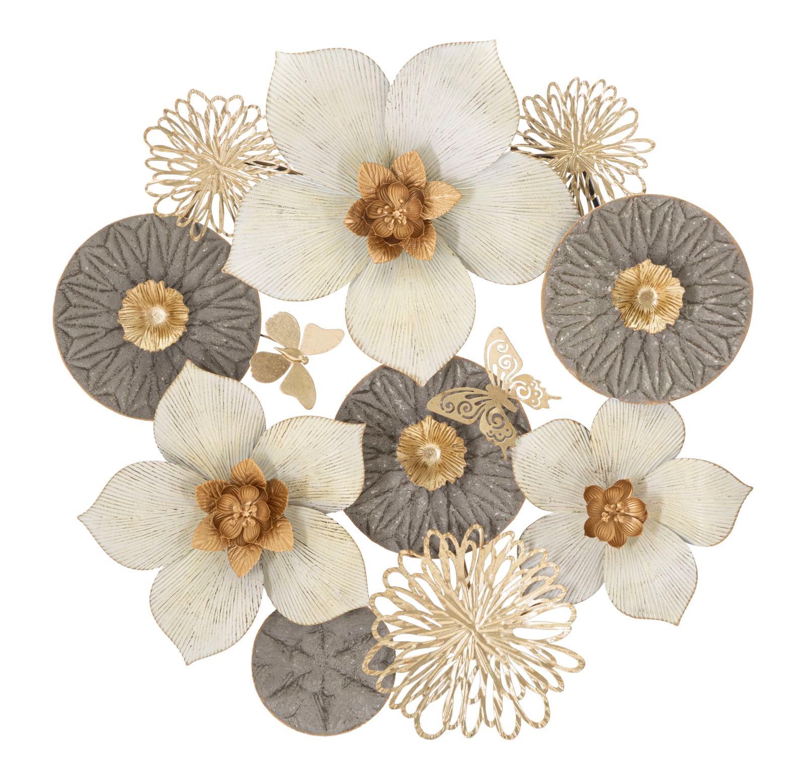 Questo pannello design si compone di fiori stilizzati, altri più realistici e delicate farfalline, realizzati tramite una elaborata e ricca lavorazione del metallo, alterando plissettatura, parti traforate e in rilievo con arabeschi, il tutto con colori come bianco, grigio e oro.