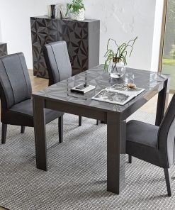 Tavolo da pranzo moderno allungabile Diagos, uno dei nostri modelli che spiccano all’interno della categoria per estro ed eleganza. Il tavolo design Diagos conquista per il piano decorato con trama poligonale serigrafata con suggestivo effetto tridimensionale. Prodotto in legno in due colori: bianco o grigio laccato lucido.