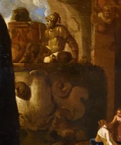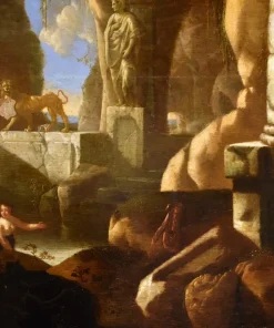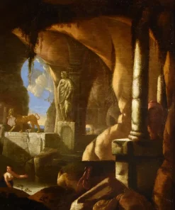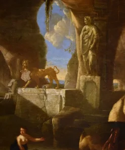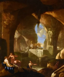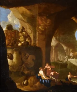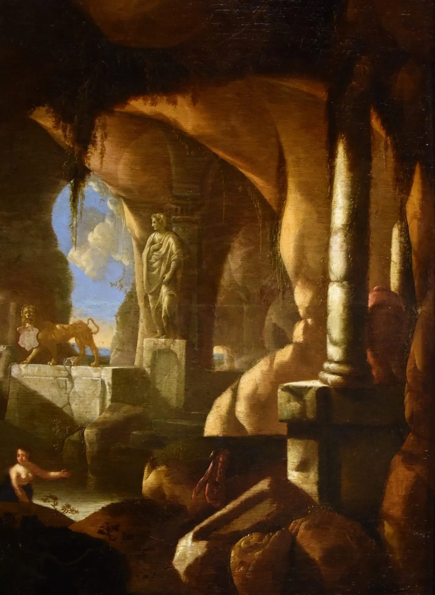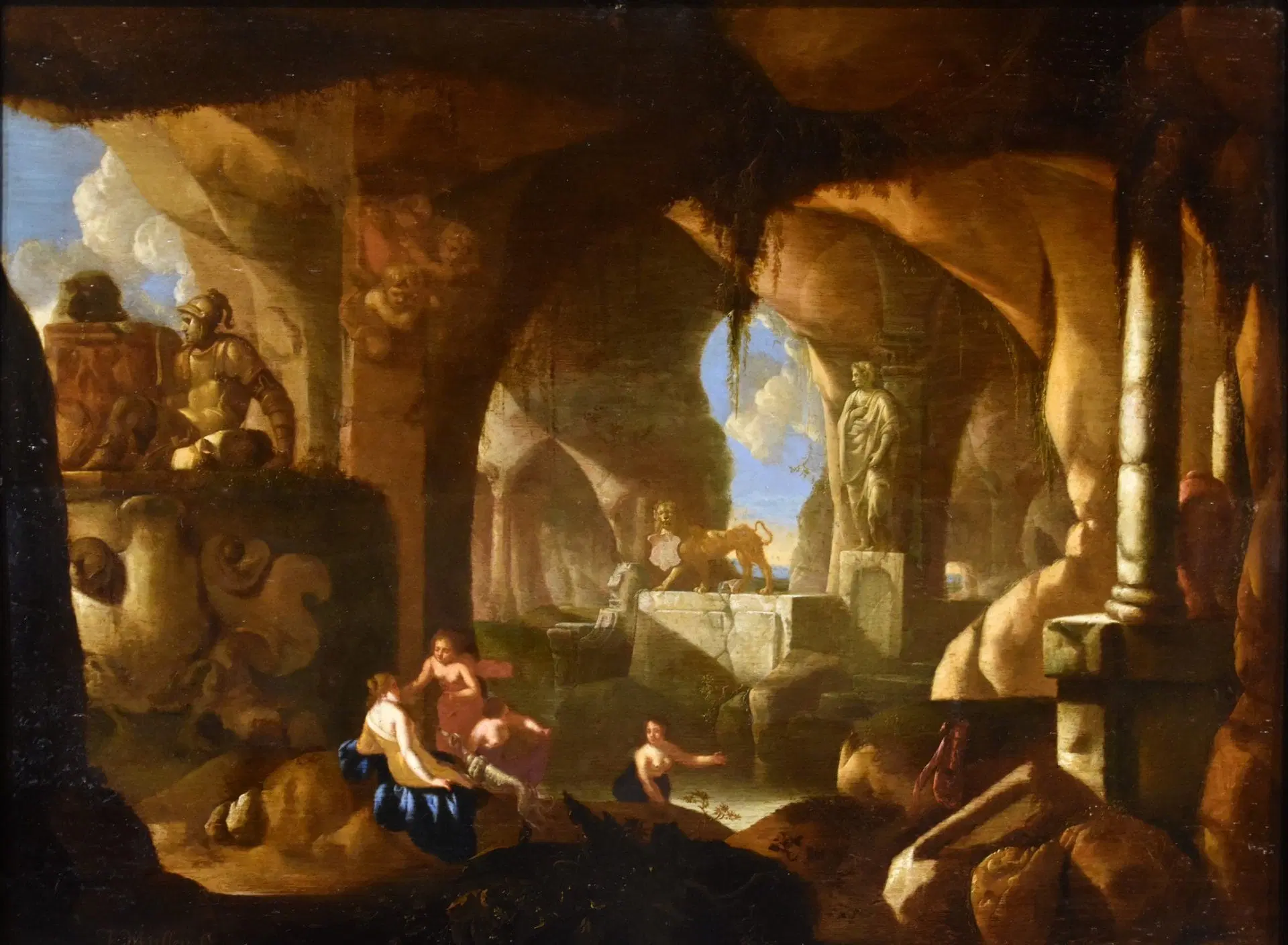 Il dipinto, che risale alla seconda metà del Seicento, riprende le celebri composizioni del fiammingo Abraham van Cuylenborch (Utrecht, 1620 – 1658), ed è certamente opera di un suo capace seguace. In particolare si tratta di un’opera firmata dal fiammingo Jacques Muller (Utrecht 1630-c.1680), attivo ad Utrecht intorno alla metà del Seicento ed allievo di Abraham van Cuylenburgh; dal maestro eredita un singolare repertorio figurativo, con questo tipo di rappresentazioni di grotte costellate da dettagli tratti dall’antichità, rovine, sculture classiche e frammenti architettonici. A titolo esemplificativo possiamo ad esempio ricordare