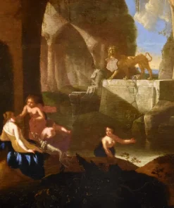 In una suggestiva grotta, la casta Diana accompagnata dalle fedeli ninfe e dal suo levriero si è ritirata per riprendere le forze dopo una battuta di caccia. Sono tutte radunate ai bordi di uno specchio d’acqua al centro dell’anfratto, con la dea intenta a svestirsi pronta per un bagno fresco.