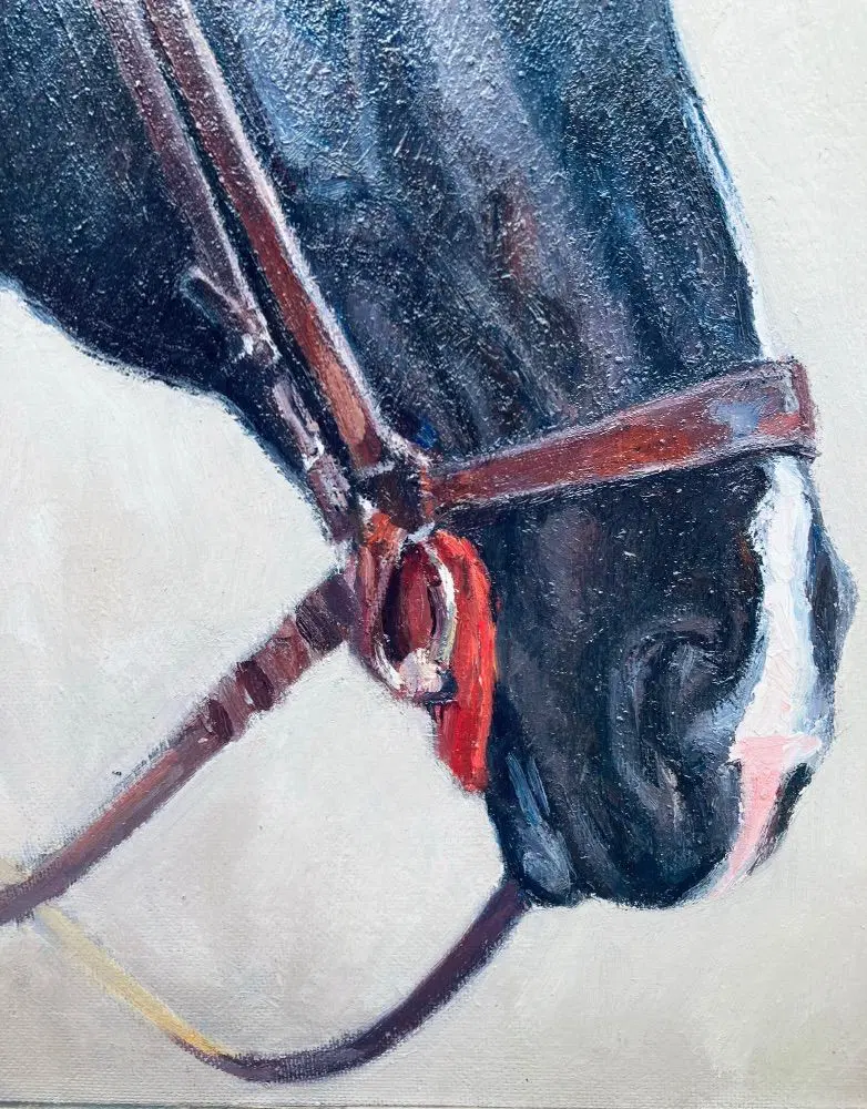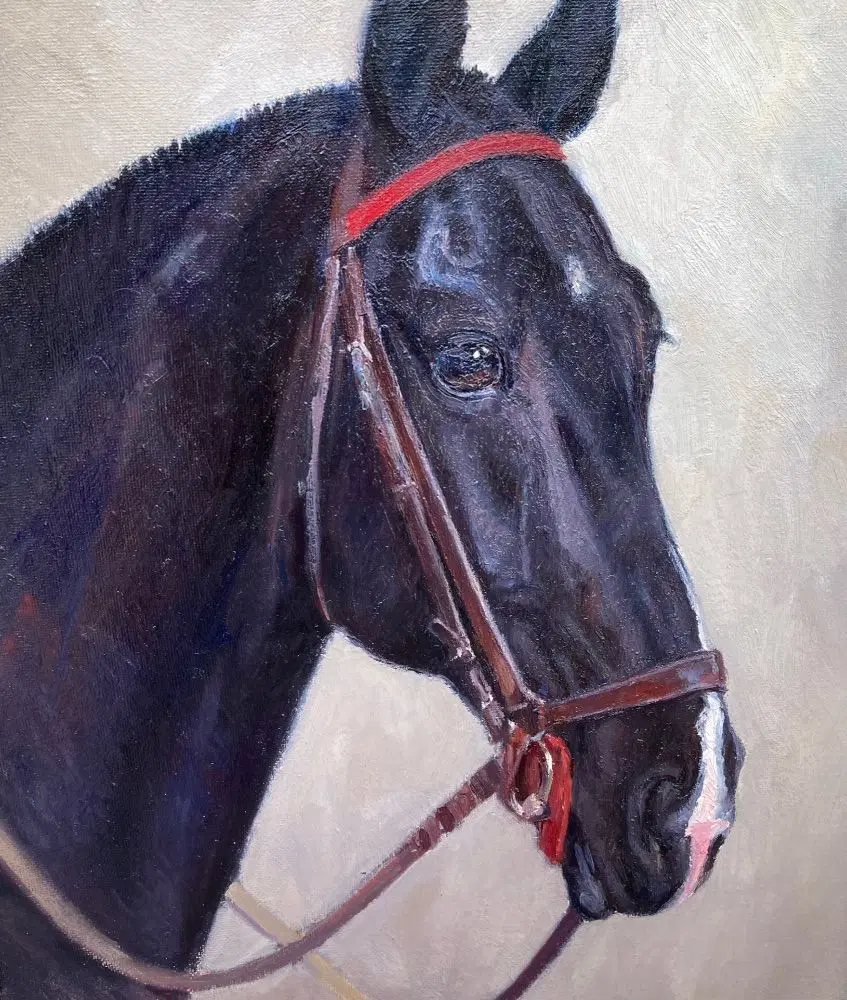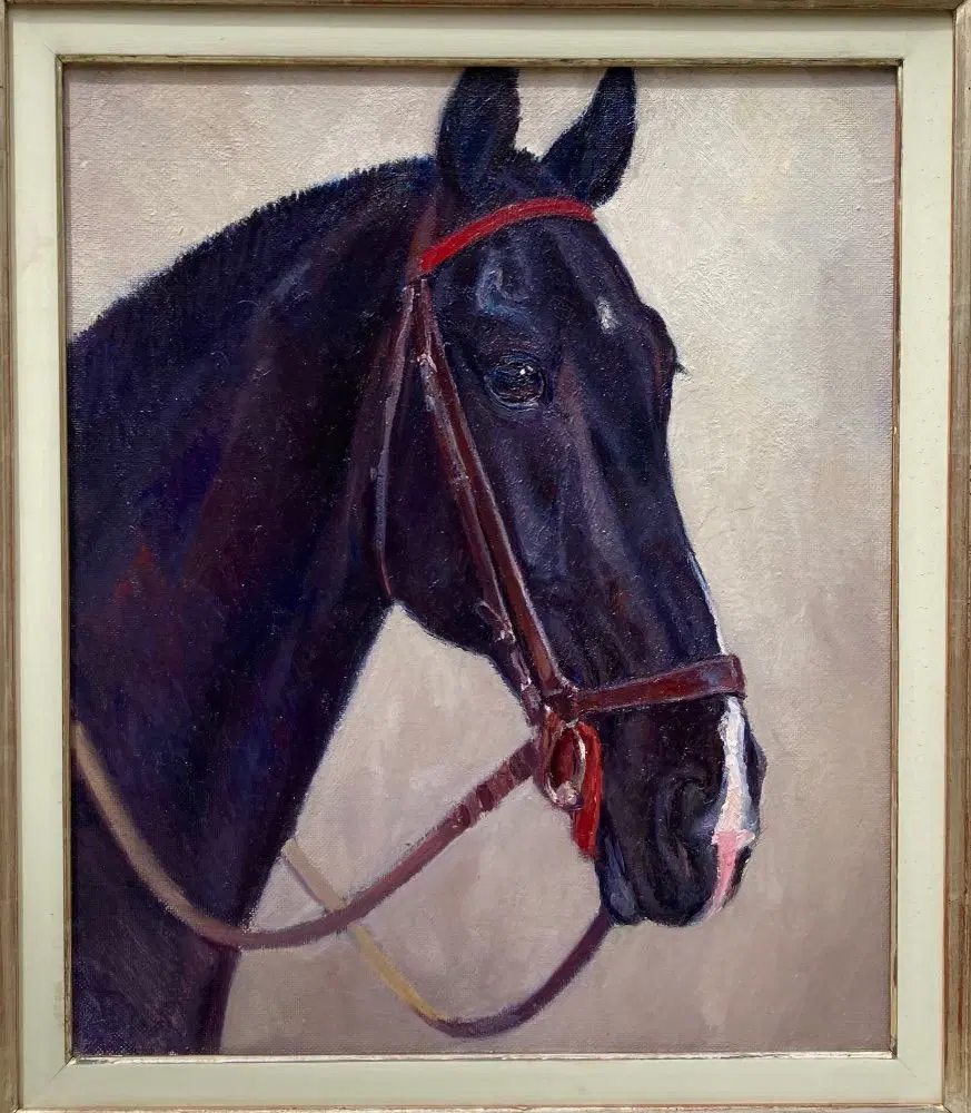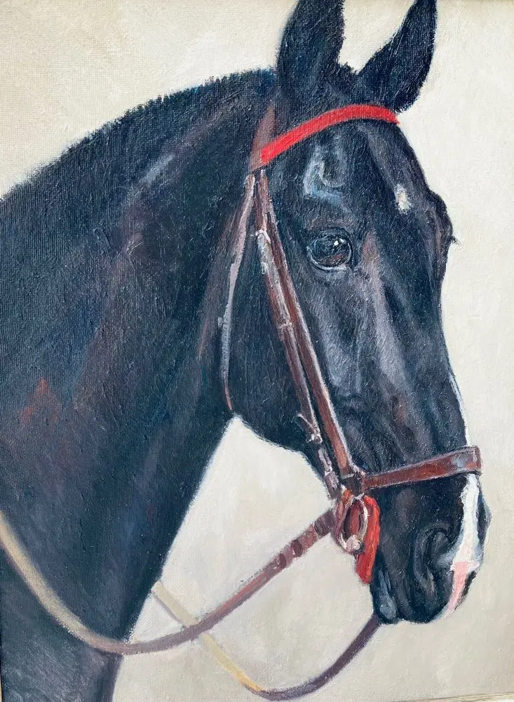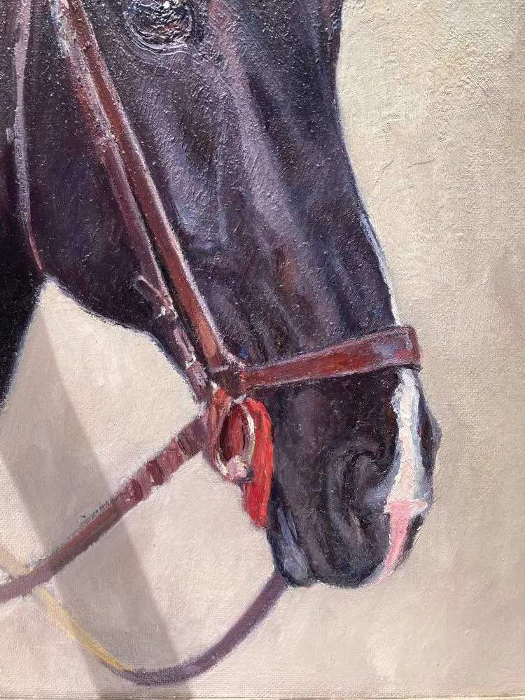 Dipinto Animalier originale olio su faesite raffigurante studio -ritratto di uno dei cavalli allevati presso il Reitpferd Hannoveraner Verband , con etichetta originale sul retro.