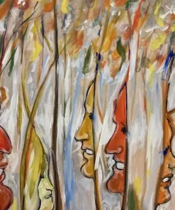 Dipinto di arte contemporanea a smalti policromi su tela raffigurante volti e natura . Firmato sul retro Celaia 1980