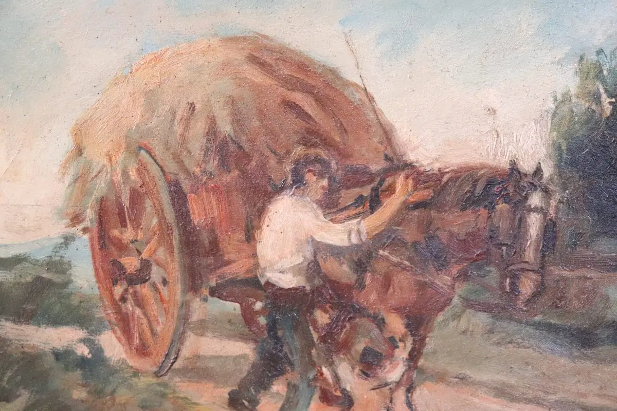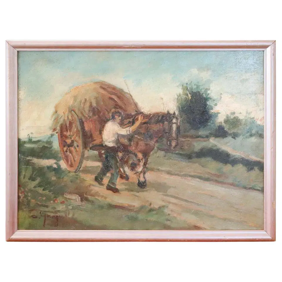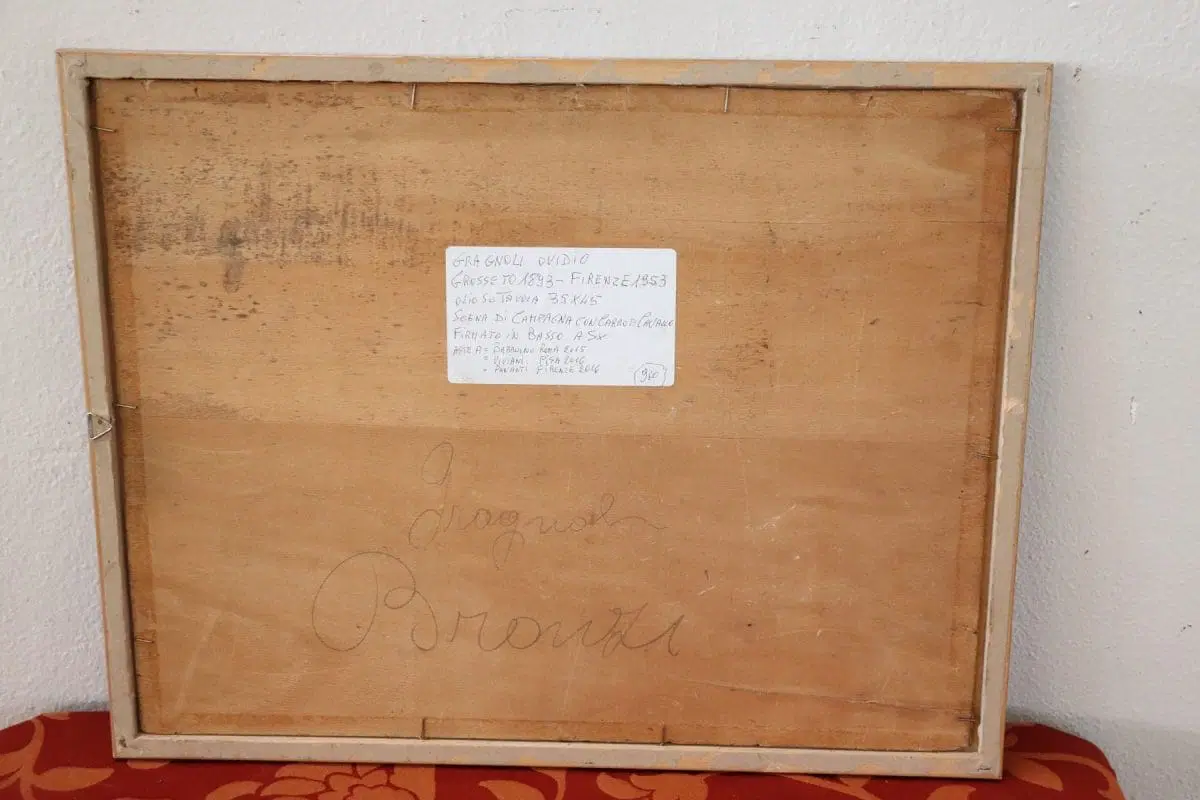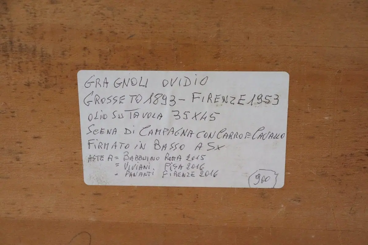 Dipinto olio su tavola prima metà del secolo XX. Dipinto di ottima qualità pittorica firmato Gragnoli Ovidio (1893/1953) scena di campagna con contadino, carro e cavallo. Ottimo prezzo trattabile inviate la vostra proposta di acquisto.