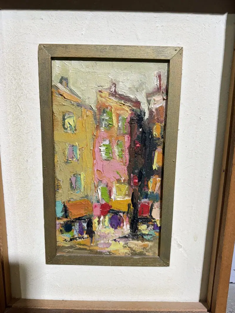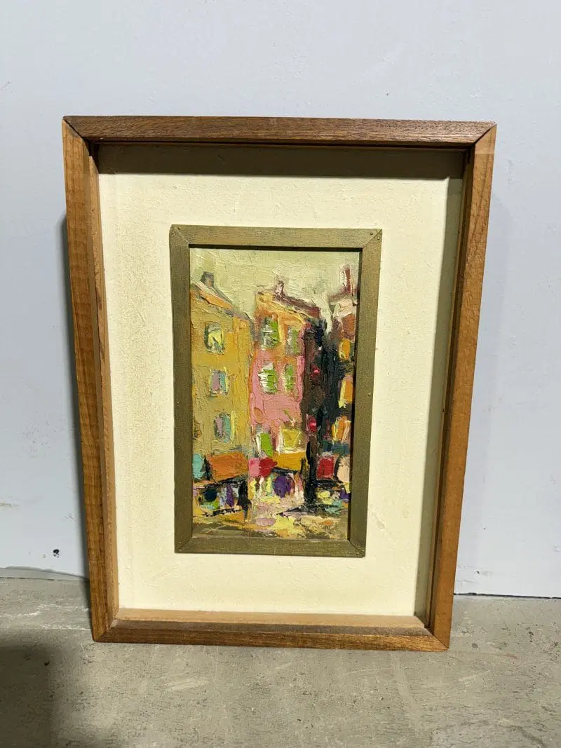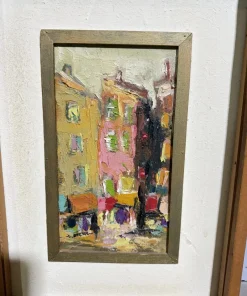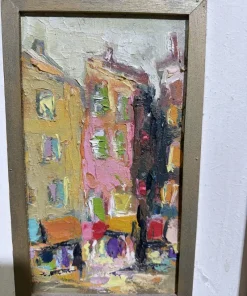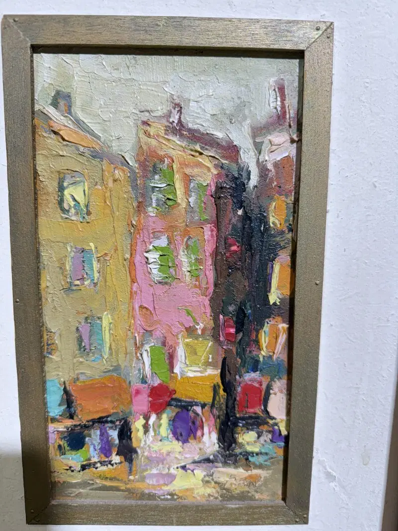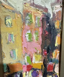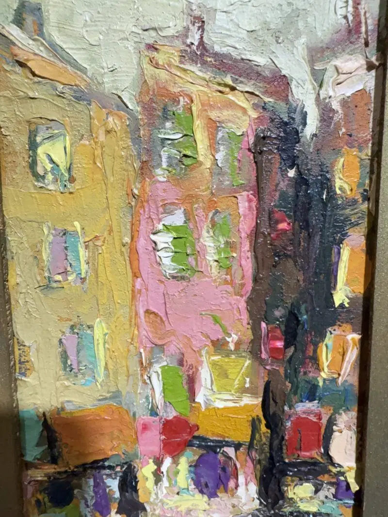 Dipinto olio su tavoletta del XX sec., raffigurante “Scorcio di città”. Colori vivaci, molto materico, mis: 38×26 cm