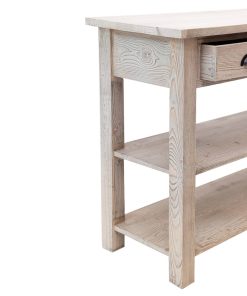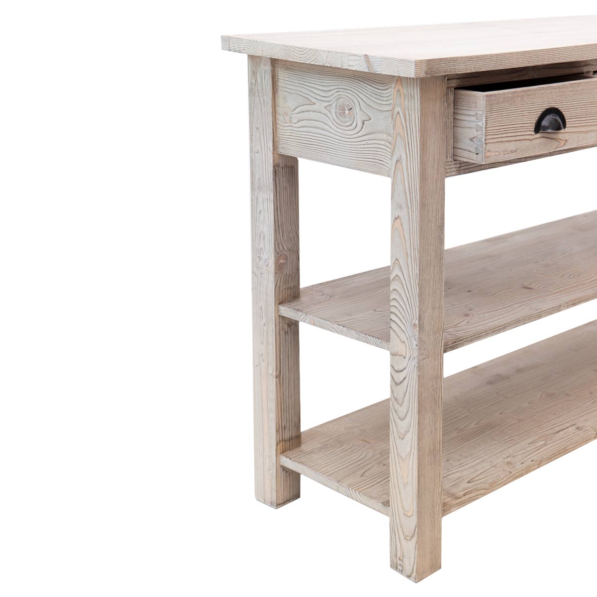Consolle da ingresso realizzata seguendo uno stile classico utilizzando legno di abete massello. Dotata di 3 cassetti apribili da pomelli in metallo e 3 piani, la consolle si rende molto utile per riporre l’oggettistica e per decorare l’ambiente circostante. L’effetto invecchiato del legno e del metallo applicato alla consolle sprigiona la classicità che costituisce la consolle, rendendola adatta ad ogni ambiente.