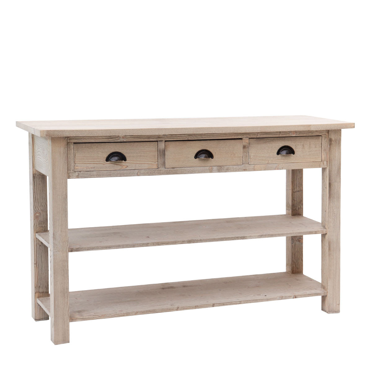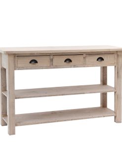 Consolle da ingresso costruita interamente in legno di abete massello con effetto invecchiato per risaltare lo stile classico della composizione. La consolle è provvista di tre cassetti decorati da pomelli in metallo anticato che permettono di riporre facilmente e in sicurezza oggetti ed effetti personali e 3 piani di appoggio, suddivisi in due piani inferiori ed un top, molto utili durante l’allestimento con decorazioni che abbelliscono l’ambiente in cui viene posizionata la consolle.